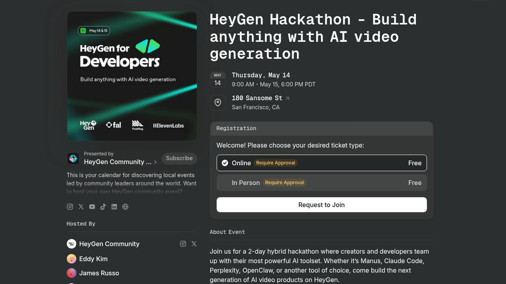 This reads like ecosystem expansion, not just an event: HeyGen is using the hackathon to pull serious builders into its video platform and make API-first video creation feel like a real startup primitive.