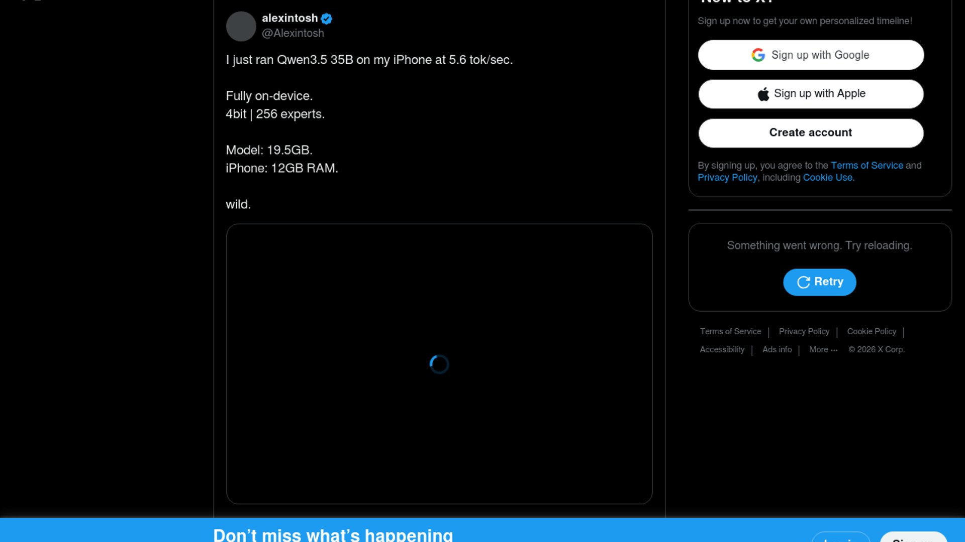 Alexintosh says he ported a Metal inference engine to iOS and got Qwen3.5 35B running fully on-device in 4-bit at 5.6 tok/sec. The demo uses SSD streaming for MoE experts and hints at a bigger 379B run next.