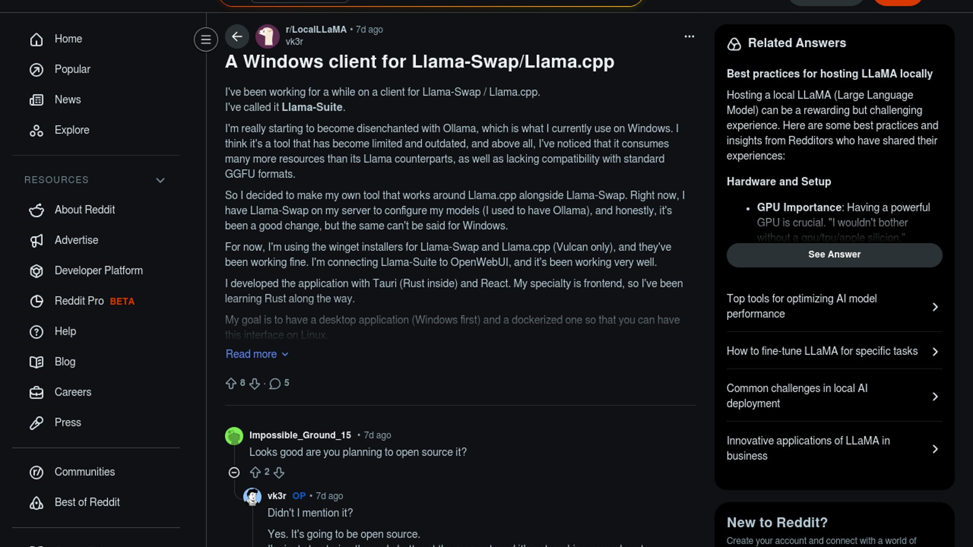 Llama-Suite is a still-unreleased Windows desktop companion for Llama.cpp and LlamaSwap, and its latest dev update focuses on fixing RAM-heavy log rendering, improving VRAM usage calculations, and redesigning model management. The developer also says the repo will open once the app reaches a more stable state.