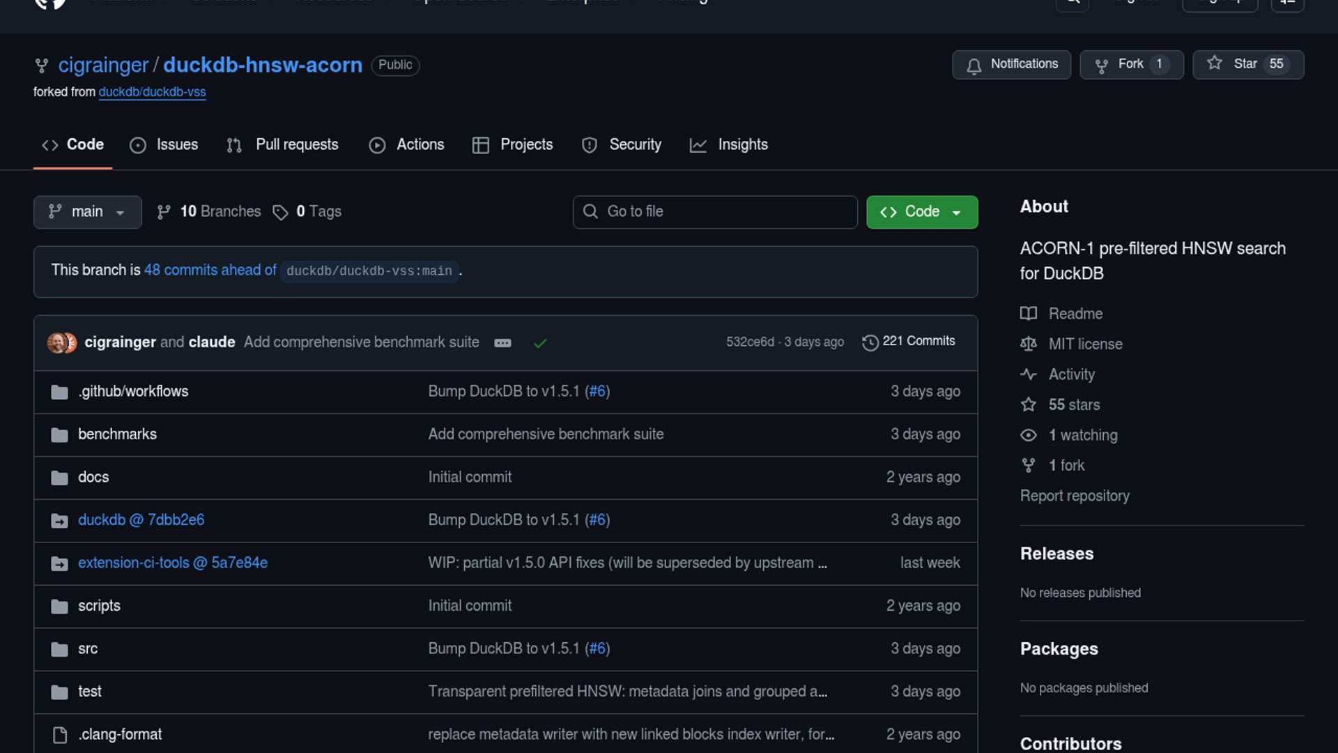 A high-performance DuckDB extension that integrates the ACORN-1 algorithm to enable accurate, pre-filtered vector search directly within SQL queries. It solves the "post-filtering" accuracy drop in current vector extensions and introduces RaBitQ 1-bit quantization for a 30x reduction in memory footprint, allowing large-scale RAG workloads on standard hardware.