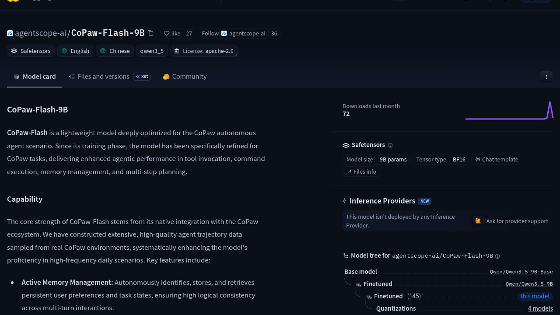 Alibaba's AgentScope team released CoPaw-Flash-9B, a Qwen3.5-9B finetune tuned for CoPaw-style tool use, memory, and multi-step planning. It looks like a specialist agent model, not a clear general-purpose upgrade over Qwen3.5-9B.