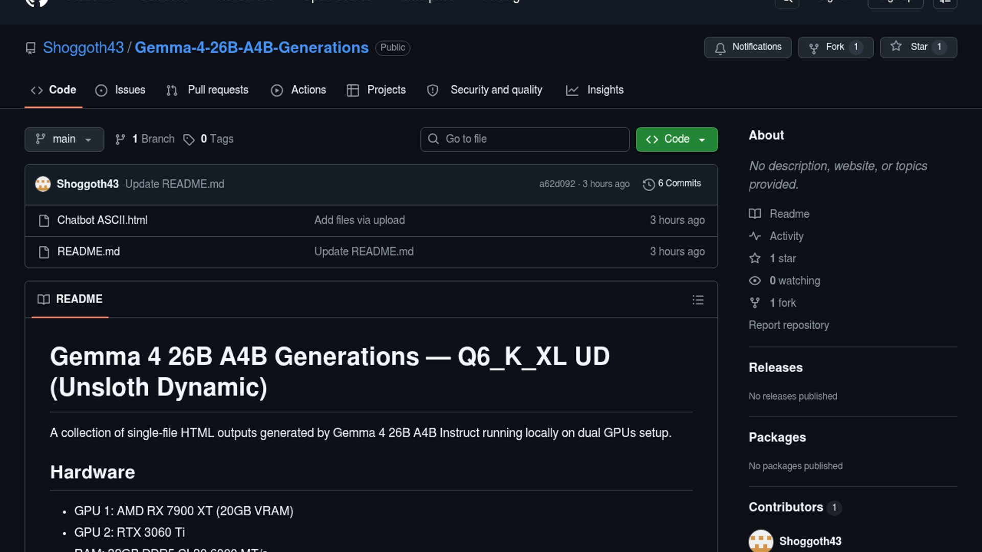 A GitHub-hosted single-file HTML chatbot demo built around Gemma 4 26B A4B Instruct running locally across an AMD RX 7900 XT and an RTX 3060 Ti. The page connects to LM Studio’s API and includes streaming output, Markdown rendering, model selection, six tuning sliders, message editing with history branching, regenerate, abort, and system prompt support. The repo frames it as a collection of generated single-file HTML outputs, with the showcased chatbot being the main artifact.