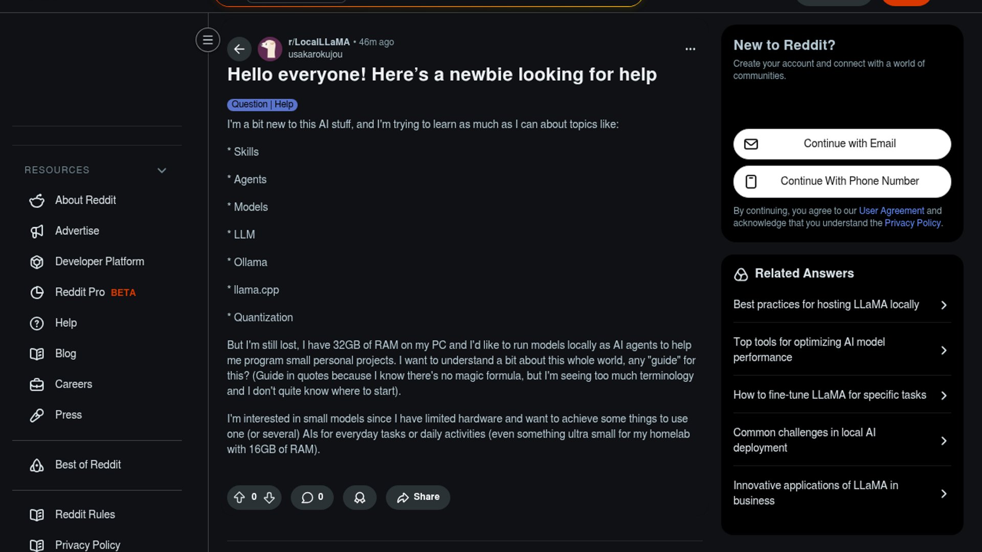 A Reddit user asks for a beginner-friendly guide to local AI, focusing on agents, models, LLMs, Ollama, llama.cpp, and quantization. The goal is to run small models on 32GB RAM for coding help, daily automation, and even an ultra-small homelab setup.
