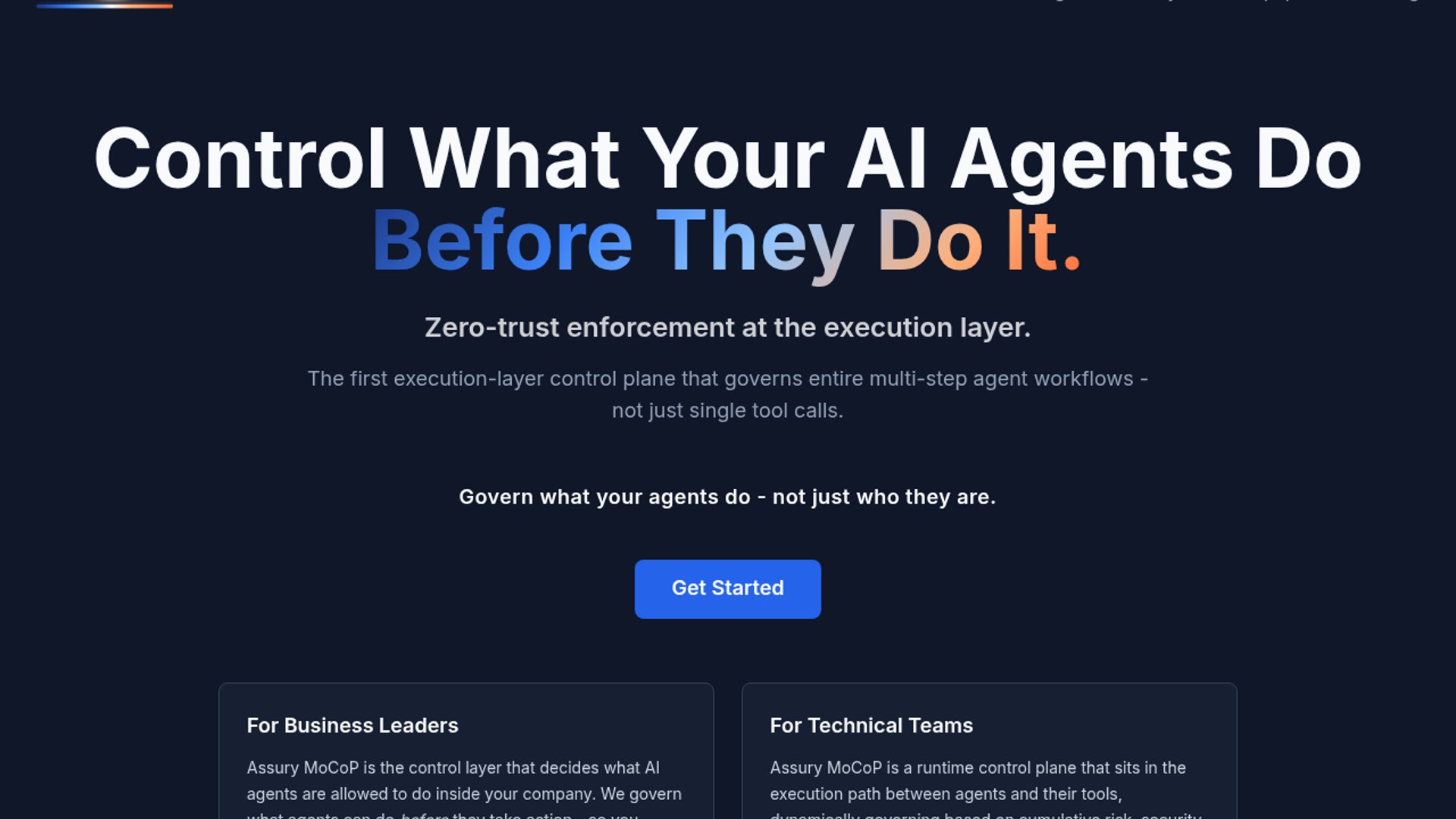 Assury MoCoP sits between agents and tools and decides, in real time, whether each action is allowed, blocked, or escalated for approval. The pitch is that agent risk compounds over a session, so it leans on autonomy zones, per-action policy, and tamper-evident logs instead of prompt filters alone.