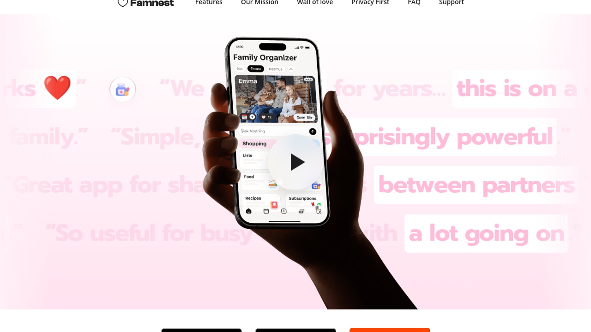 Famnest is a privacy-first family organizer built for modern households that want one shared place to manage schedules, health info, bills, and other day-to-day logistics. The product positions itself around calm coordination and trust, with privacy as a core differentiator rather than an afterthought.