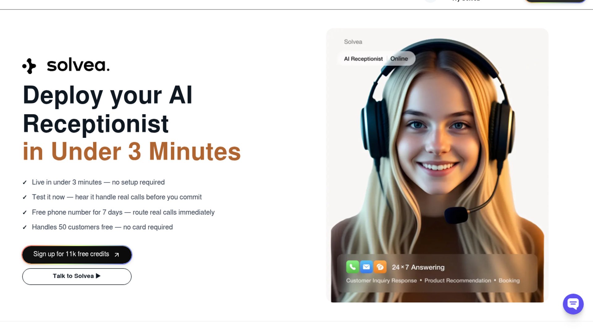 Solvea is a no-code AI receptionist for support, sales, and scheduling across phone, live chat, and email. It leans on fast setup, knowledge-driven responses, and action-taking integrations so businesses can automate front-desk work without custom engineering.