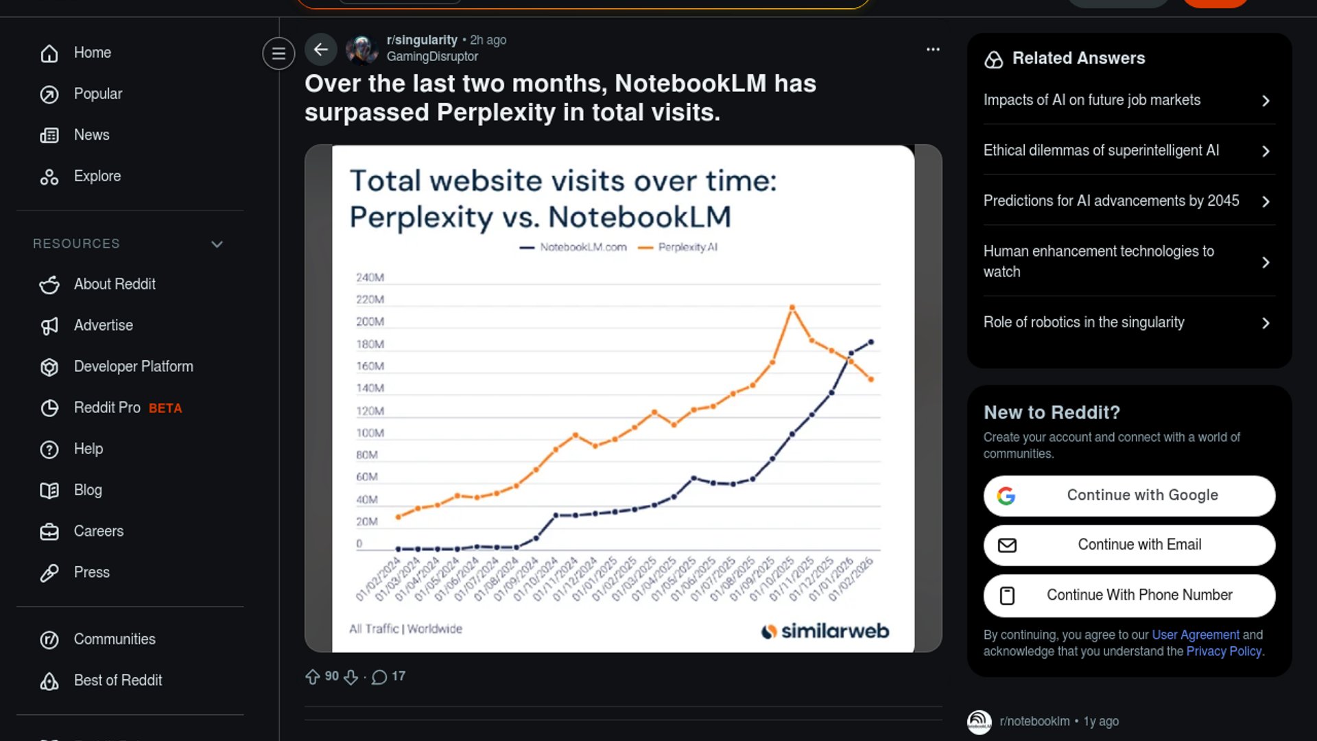 Google's NotebookLM has overtaken Perplexity AI in total web visits over the past two months, according to traffic data circulating on Reddit — a striking milestone given Perplexity held nearly a 3x traffic lead as recently as late 2024. The reversal underscores how fast document-grounded AI is capturing mainstream usage.
