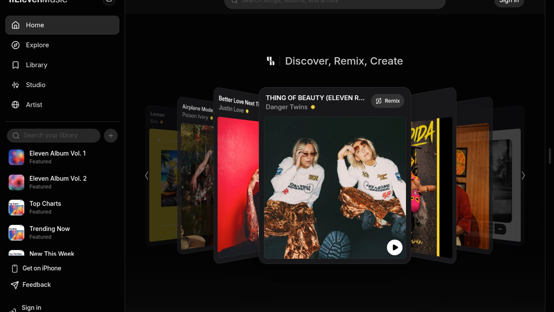 ElevenMusic is a music platform that lets listeners discover independent artists, remix existing tracks, and create original songs with AI assistance on web and iOS. Its differentiator is the creator-economy layer: artists can publish into the platform and earn royalties based on listener engagement, making it feel closer to a music marketplace than a standalone generator.