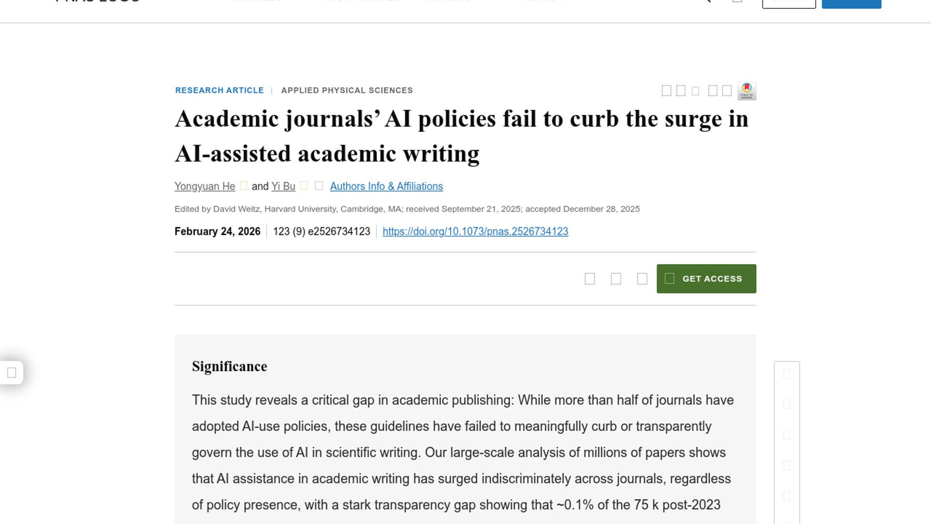 A new PNAS analysis of 5.2 million papers and 75,000 full texts found AI-assisted scientific writing has surged since 2023 while disclosures remain almost nonexistent. The paper argues journal mandates alone are not changing researcher behavior, pushing the debate from simple disclosure rules toward broader governance of generative AI in science.