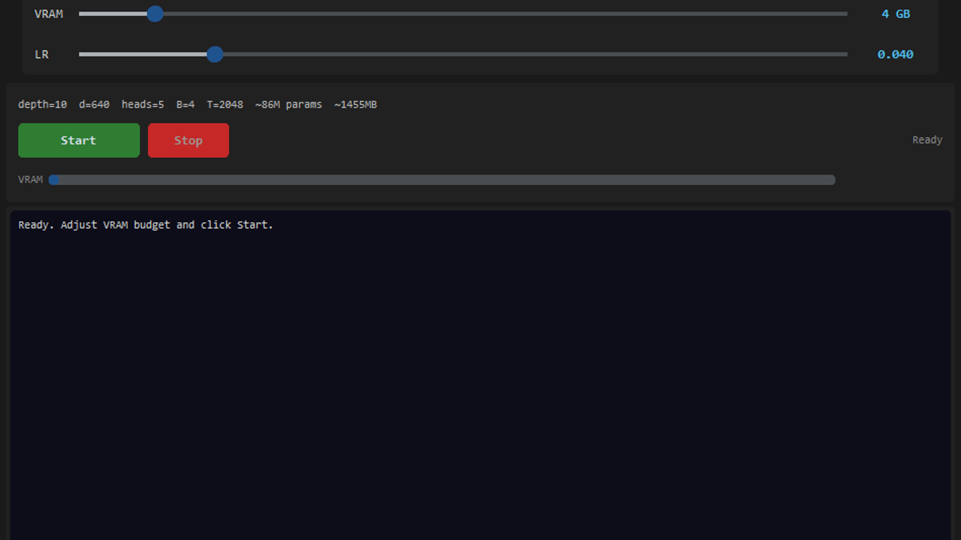 - –Replaces complex terminal outputs with a clean GUI dashboard for live VRAM and log tracking