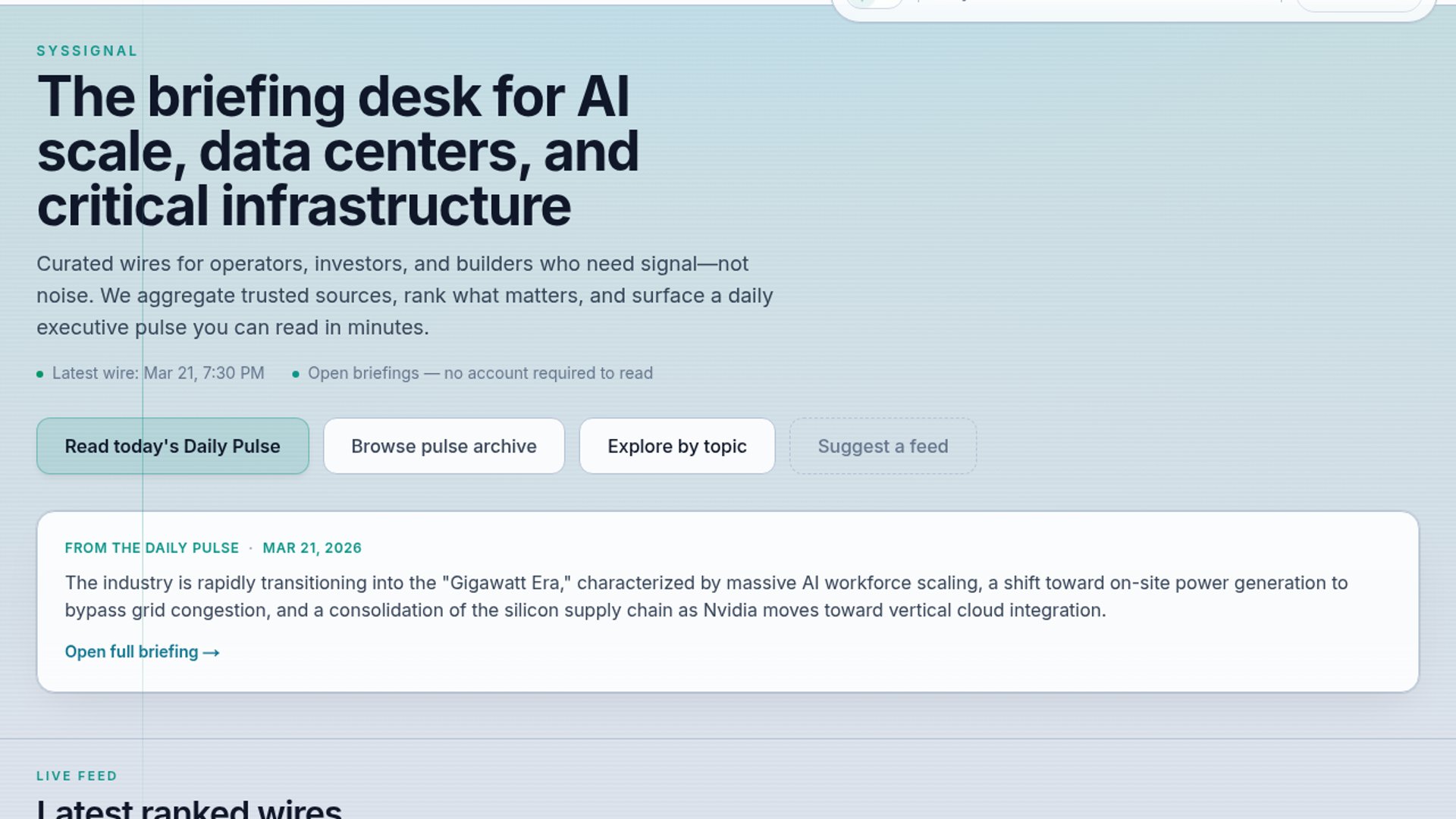 SysSignal is a vertical news aggregator focused on AI, data centers, and critical infrastructure. It pulls in trusted sources, ranks the stories that matter, and packages them into a daily pulse so readers can catch up quickly without hopping across multiple sites. The site also includes a live feed, topic browsing, a pulse archive, and a feed submission flow for expanding coverage.