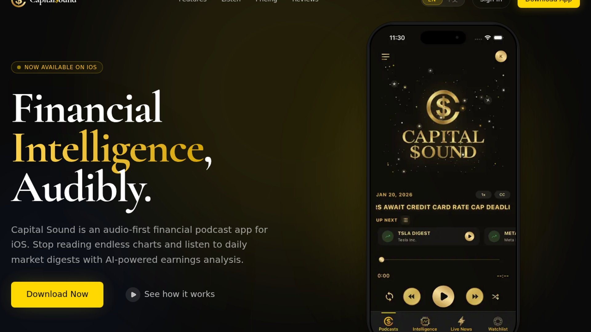 Capital Sound is an iOS-first, audio-centric market intelligence app that converts financial news, earnings reports, watchlist changes, and insider-trading signals into daily podcast briefings. It targets investors who want quick, commute-friendly updates with personalized stock briefings, AI analysis, and premium tiers for deeper coverage.