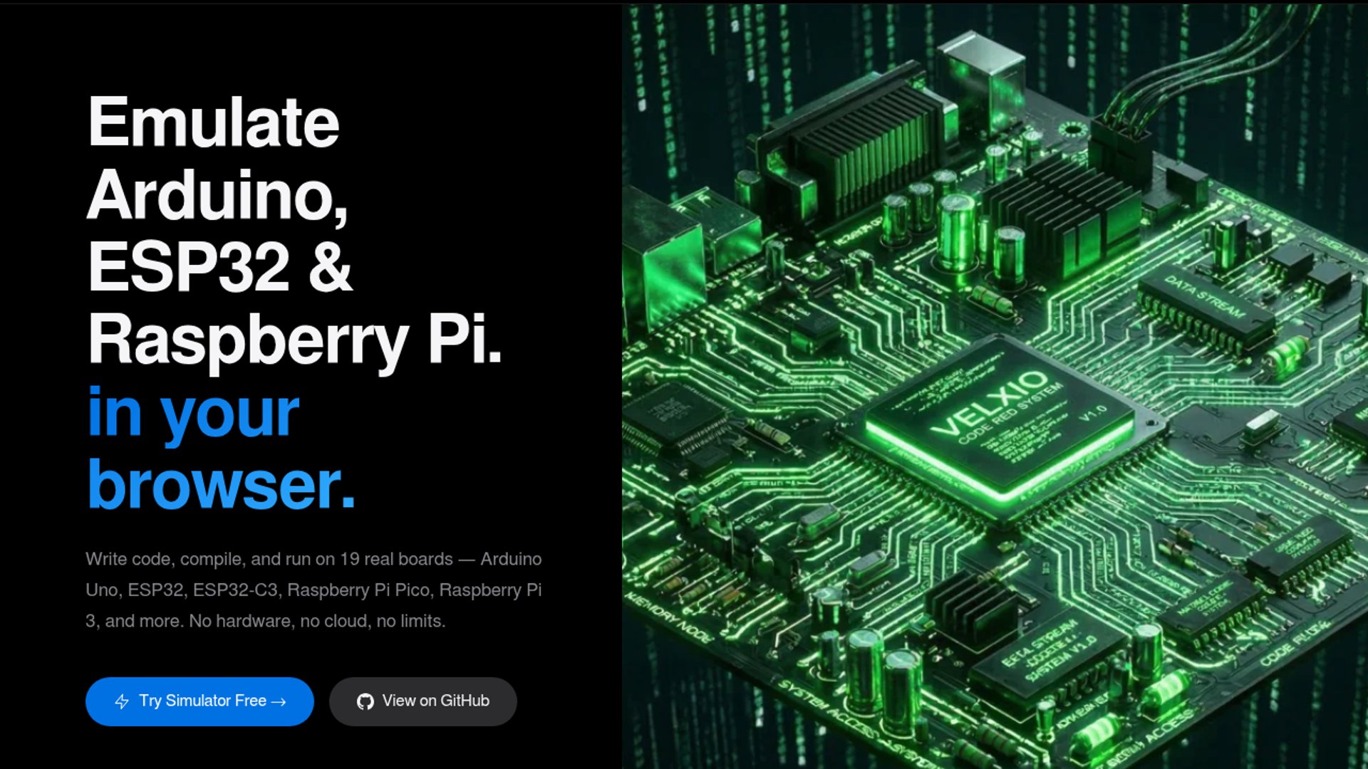 Velxio is a browser-based, open-source emulator for Arduino, ESP32, Raspberry Pi Pico, and Raspberry Pi 3, with real CPU emulation, arduino-cli compilation, and interactive components. It is built for local-first prototyping and self-hosting, not just quick demos.