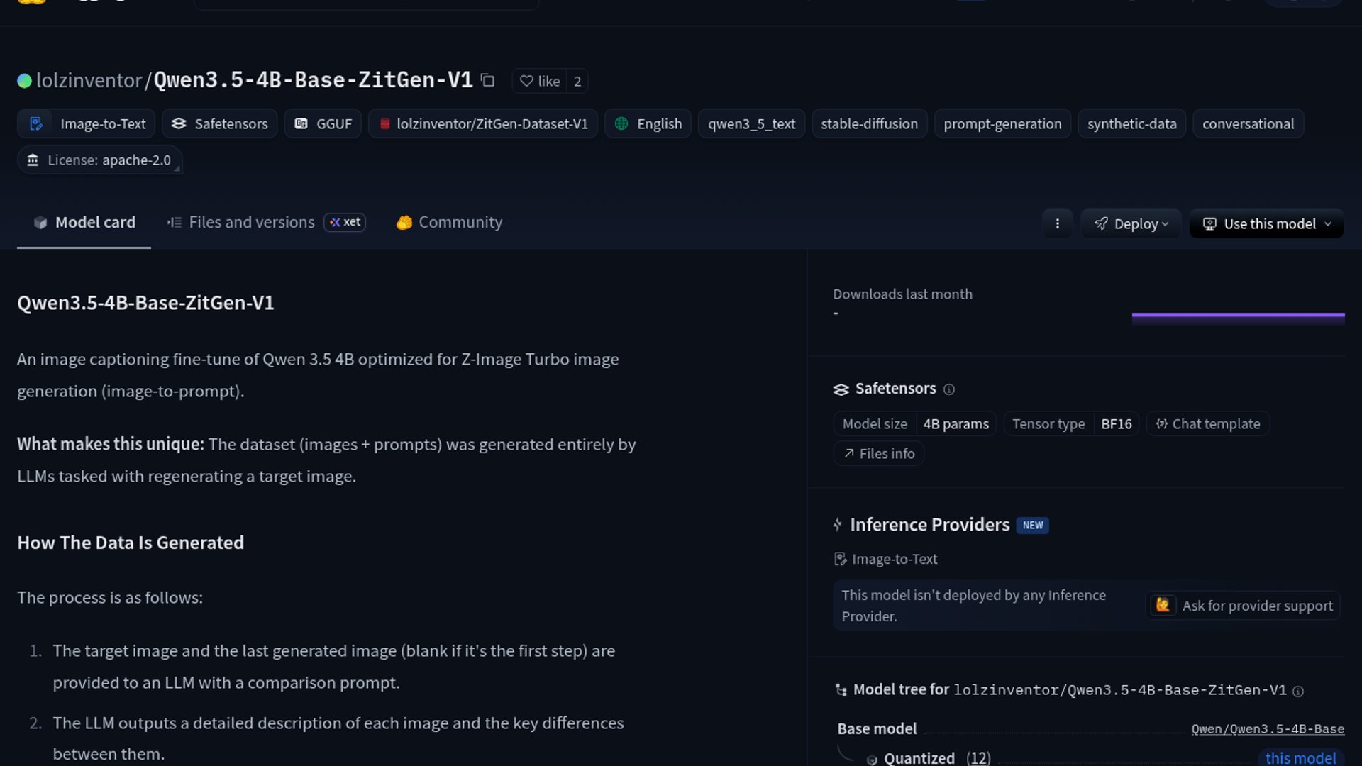 A developer has released a fine-tuned Qwen 3.5 4B model optimized for image-to-prompt generation for Stable Diffusion. The model was trained entirely on a synthetic dataset generated through an iterative, LLM-driven visual comparison pipeline.