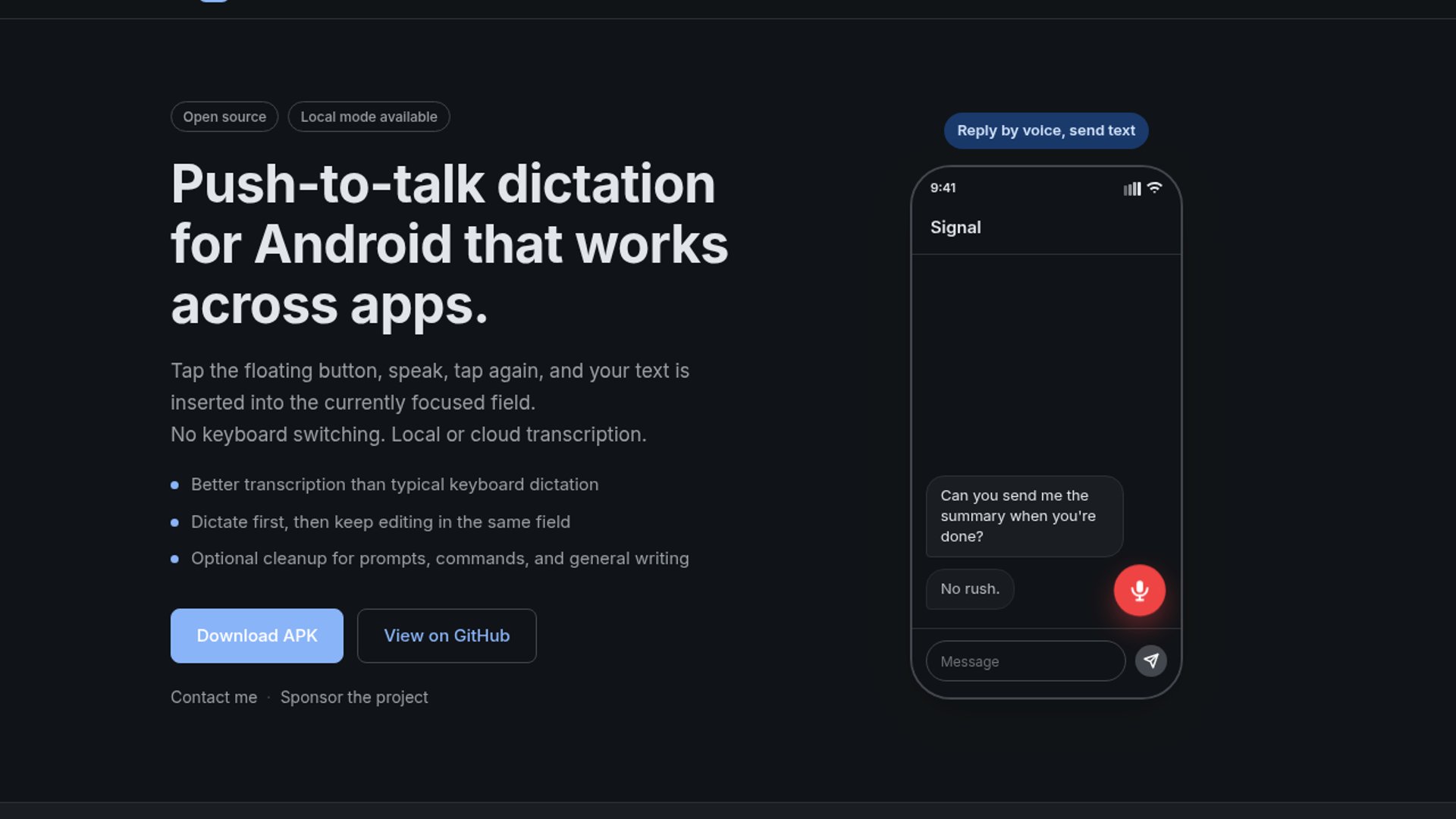 Phone Whisper is a push-to-talk Android dictation app that inserts transcribed text into the focused field without replacing your keyboard. It defaults to local Whisper via sherpa-onnx, with optional direct-to-OpenAI cloud mode, downloadable model sizes, and an APK release for sideloading.