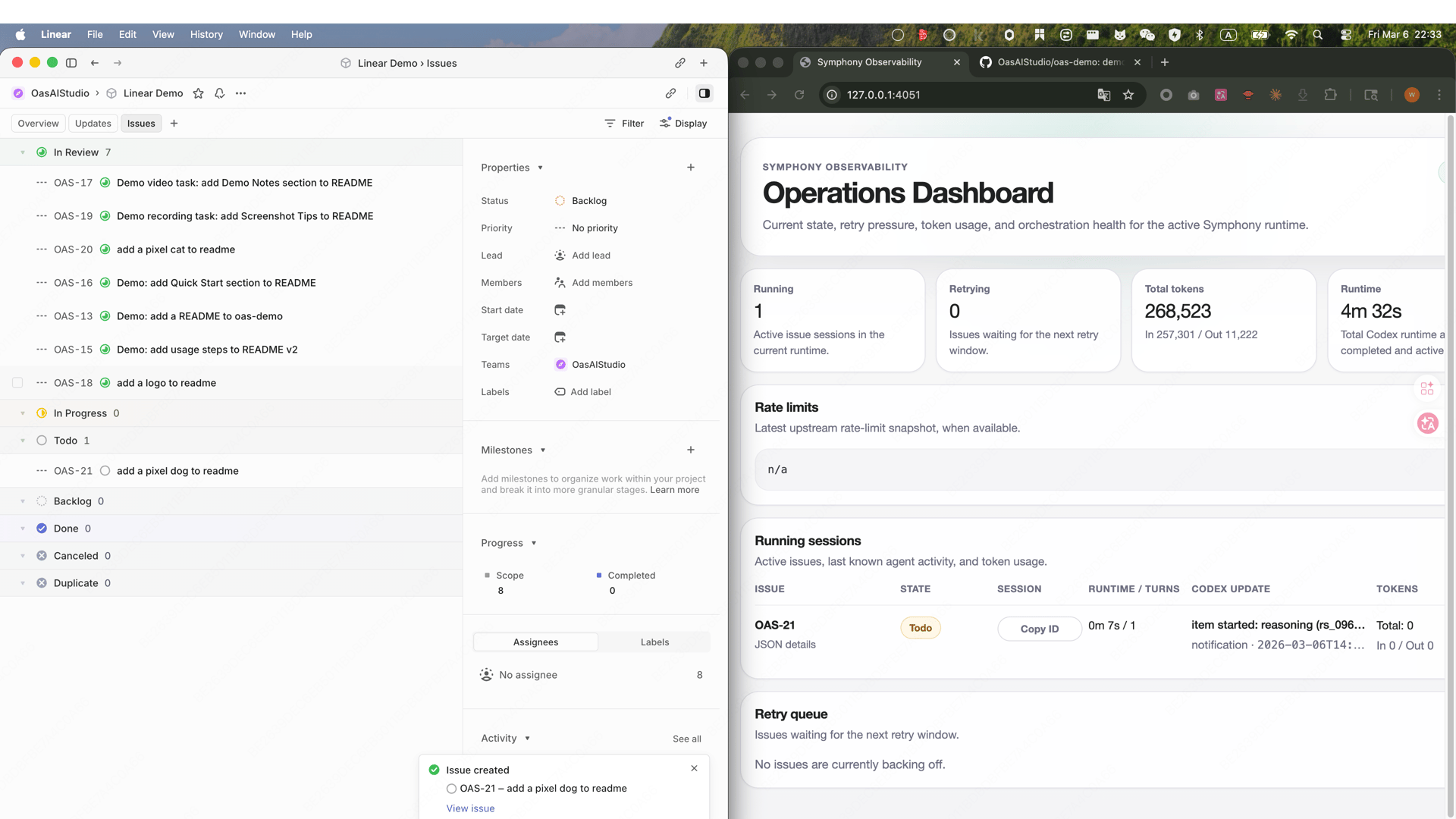- –The repo keeps the core Symphony idea intact: tracker-driven issue intake, isolated workspaces, retries, cleanup, and a live dashboard.