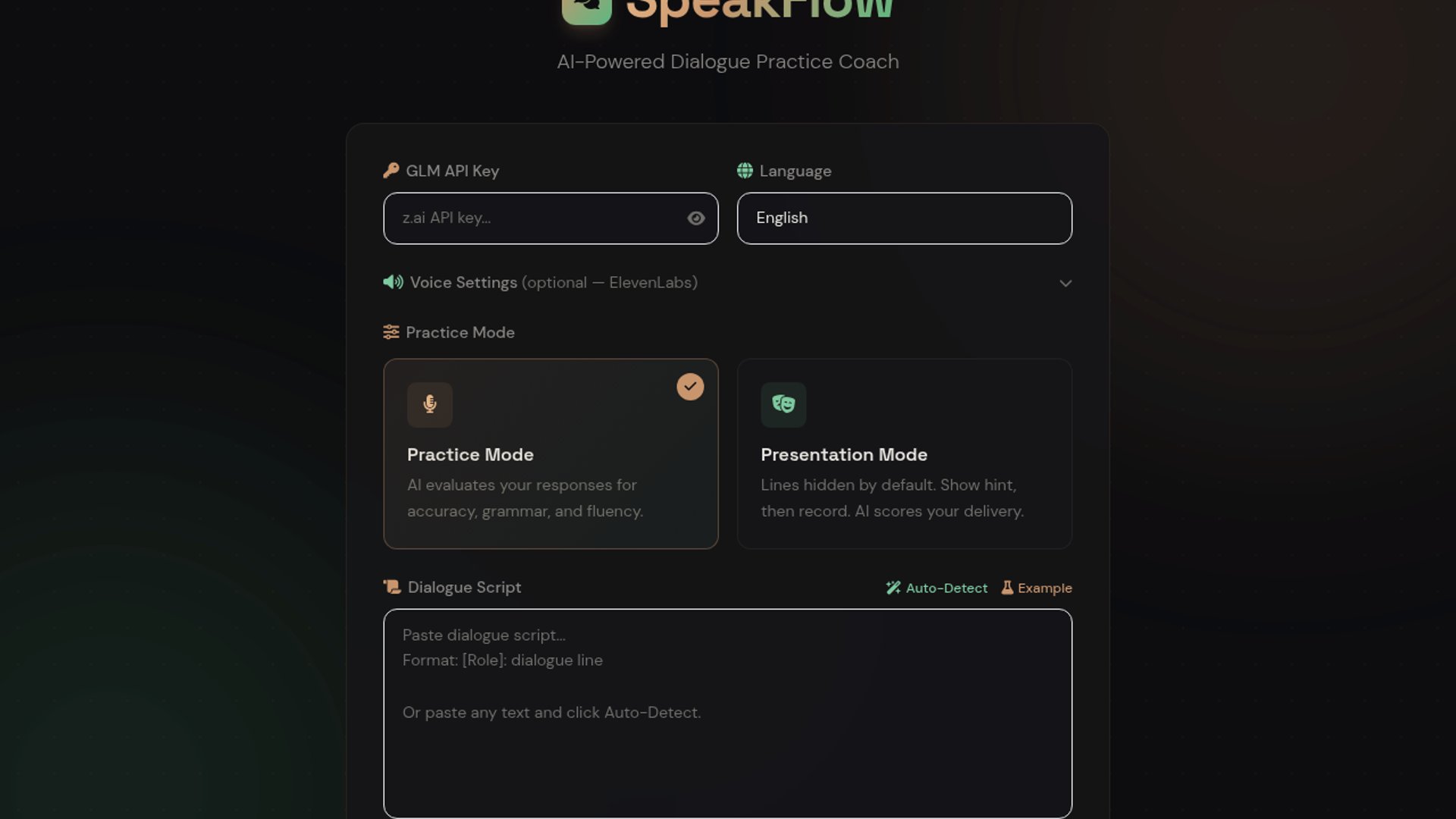 SpeakFlow is a browser-based dialogue practice coach that scores spoken responses in real time using GLM 5.1 and Web Speech API tooling. It offers Practice and Presentation modes, 11 language support, audio recording, and session reports aimed at speaking fluency drills.