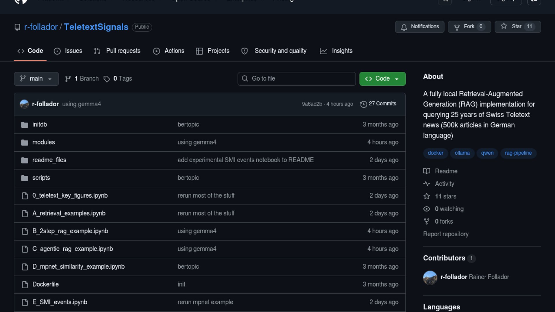 TeletextSignals is a fully local retrieval-augmented generation proof of concept for querying roughly 500,000 German-language Swiss Teletext articles spanning 25 years. It combines embeddings, PostgreSQL/pgvector, full-text search, reranking, and local LLM workflows so queries and source documents stay on-device, making it both a privacy-preserving RAG demo and a useful testbed for short, high-density news summaries.