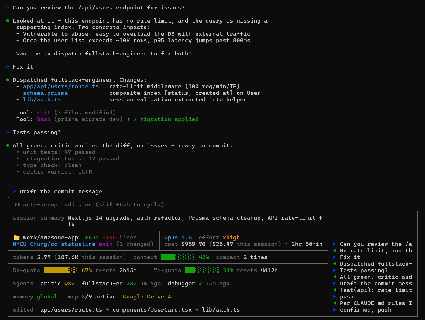cc-statusline is an open-source Claude Code statusline dashboard that surfaces active model, session cost, token/context usage, quota bars, agents, MCP health, and recent message history directly in the CLI. It targets developers who want budget and context visibility without interrupting their coding flow.
