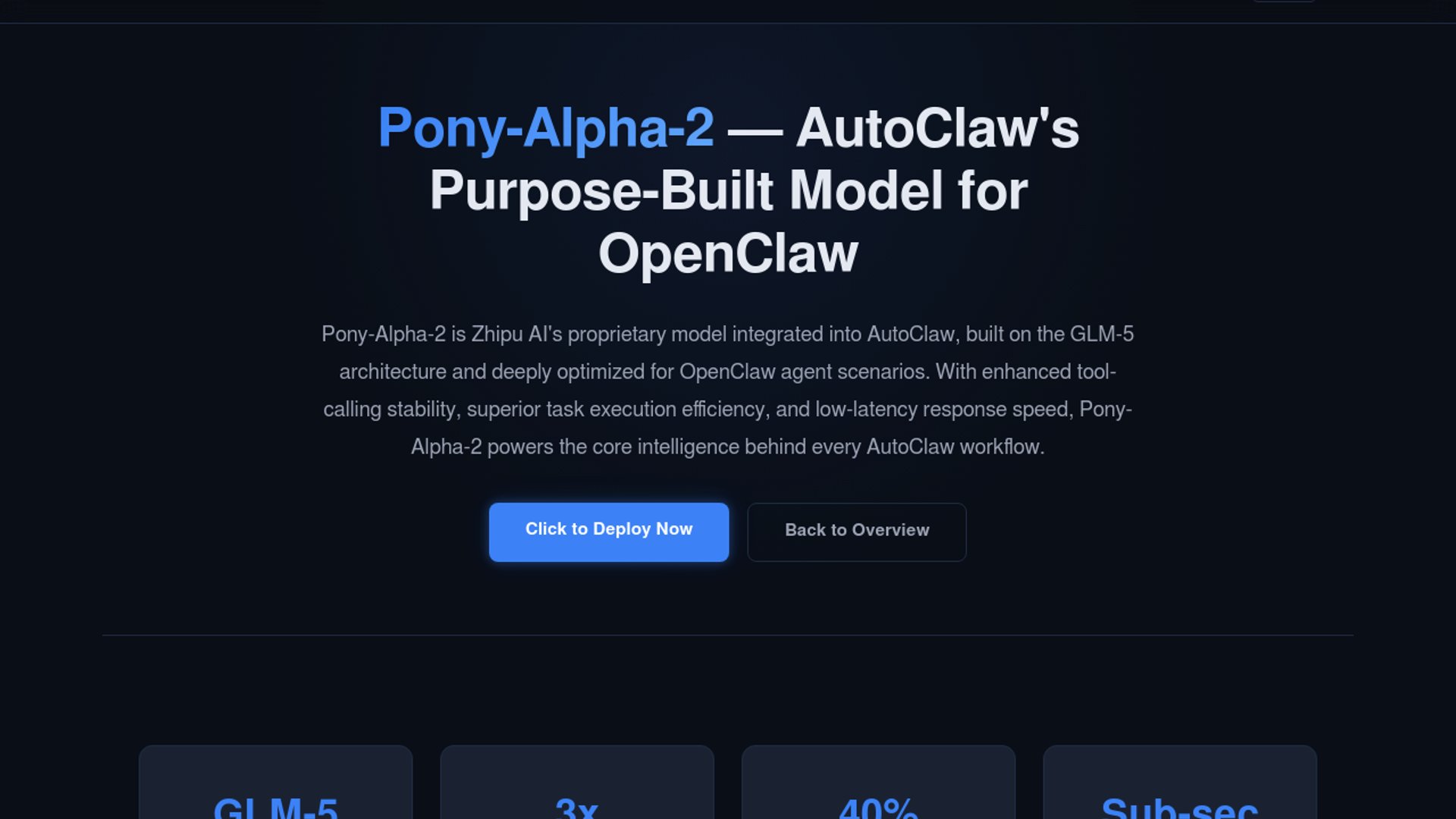 Z AI's Pony Alpha 2, a GLM-5 fine-tune purpose-built for agent workflows, is now in early access via AutoClaw — Zhipu's free one-click desktop launcher. It delivers ~40% fewer execution steps, sub-second latency, and stronger tool-calling stability over base GLM-5.