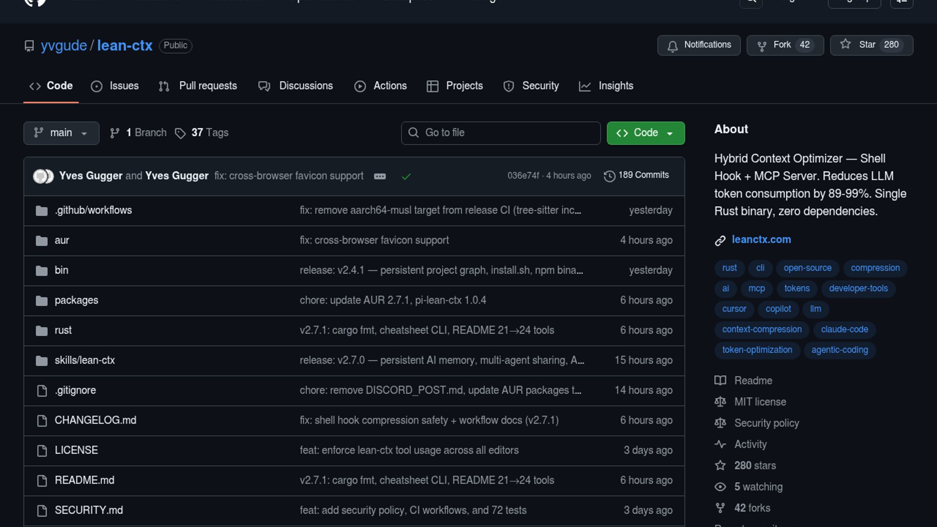 Lean Ctx is a Rust-based hybrid context optimizer that reduces LLM token consumption using shell hooks and an MCP server. It employs specialized protocols for cognitive efficiency and cross-session memory to keep context windows lean and focused while providing agents with persistent task history.