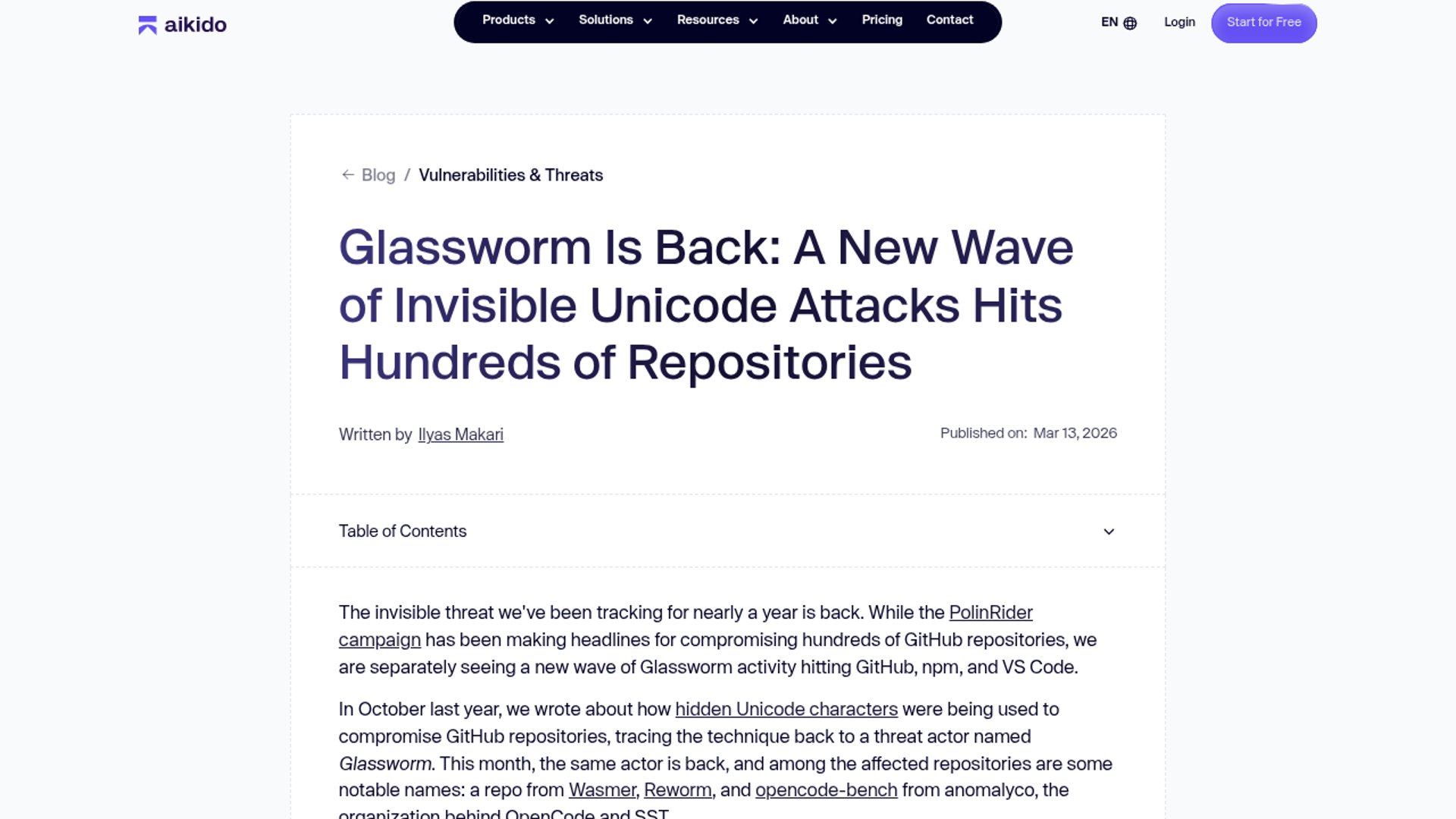 - –Aikido Security's detection tooling is purpose-built to catch invisible Unicode injection — this post doubles as product marketing, but the threat research is solid and independently corroborated by Snyk, Dark Reading, and SecurityWeek