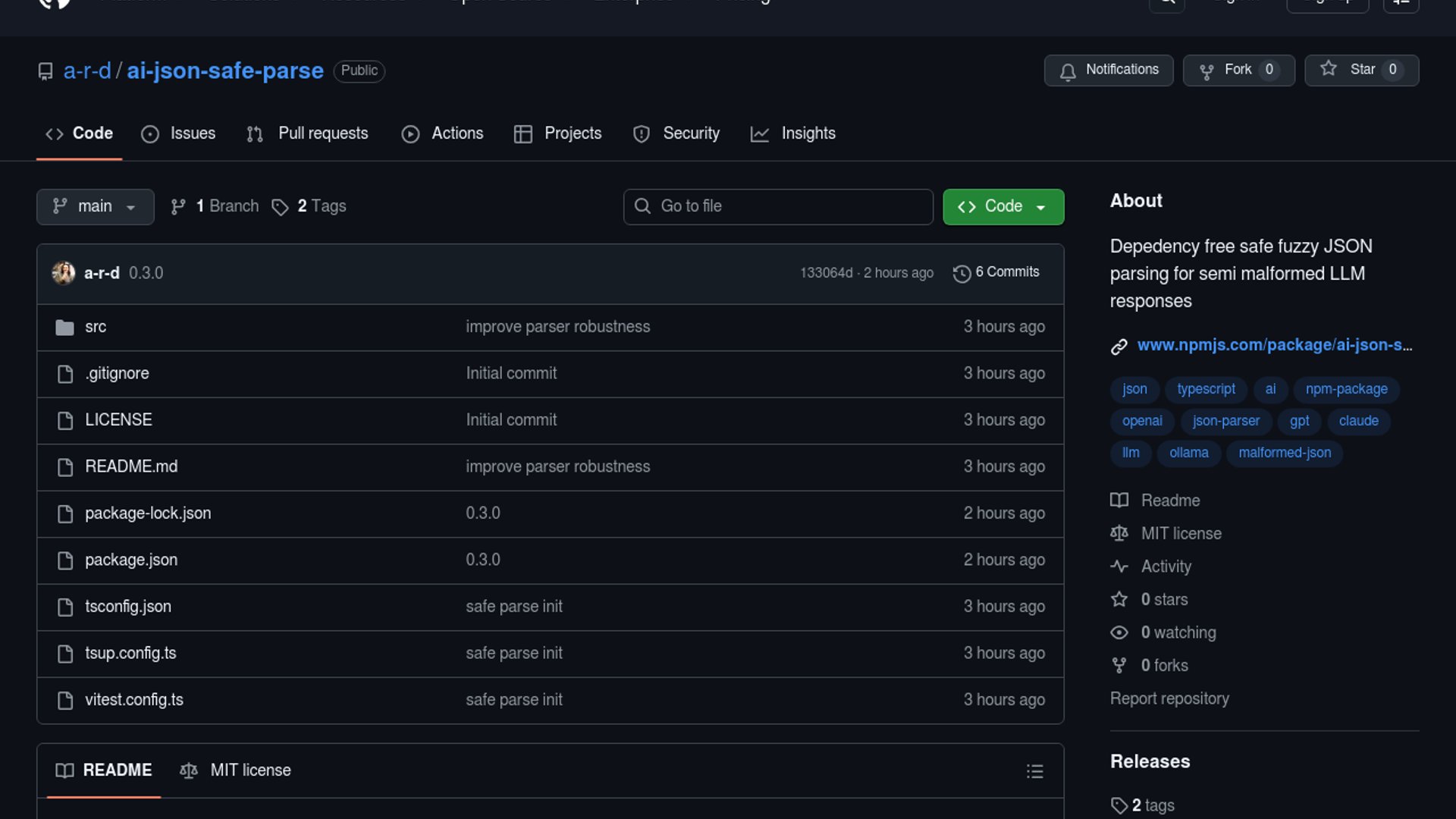The package adds a small recovery pipeline for malformed JSON from local and hosted LLMs, handling code fences, trailing commas, comments, unquoted keys, single quotes, and prose around the payload. It ships three ergonomics-friendly APIs - result, nullable, and strict throw - and is dependency-free across Node, browsers, and edge runtimes.