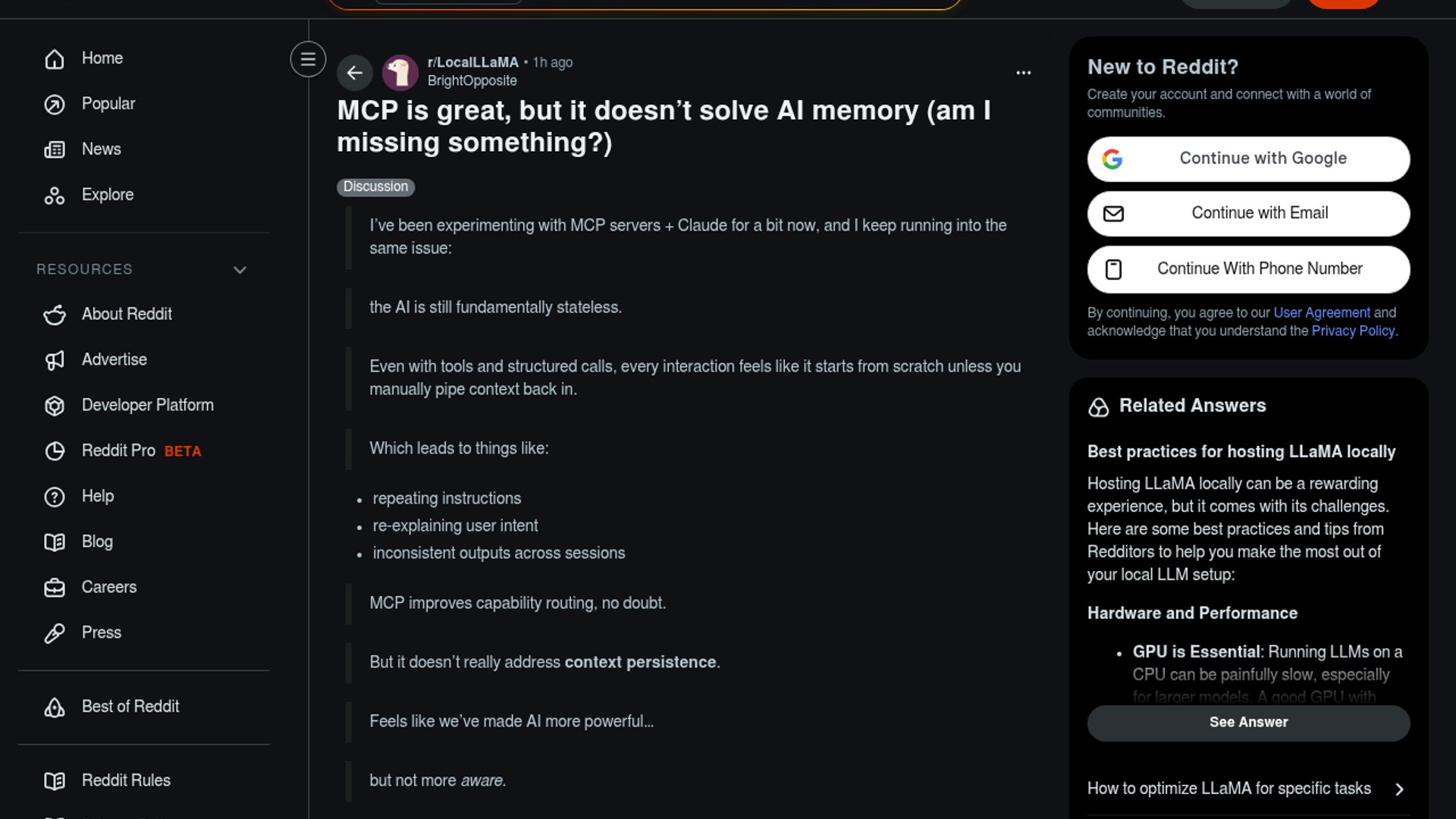 MCP makes it much easier for AI assistants to call tools and data sources, but it does not create persistent memory on its own. The Reddit thread is basically pointing at a real gap: session state, long-term context, and user intent still have to be handled by the application layer.