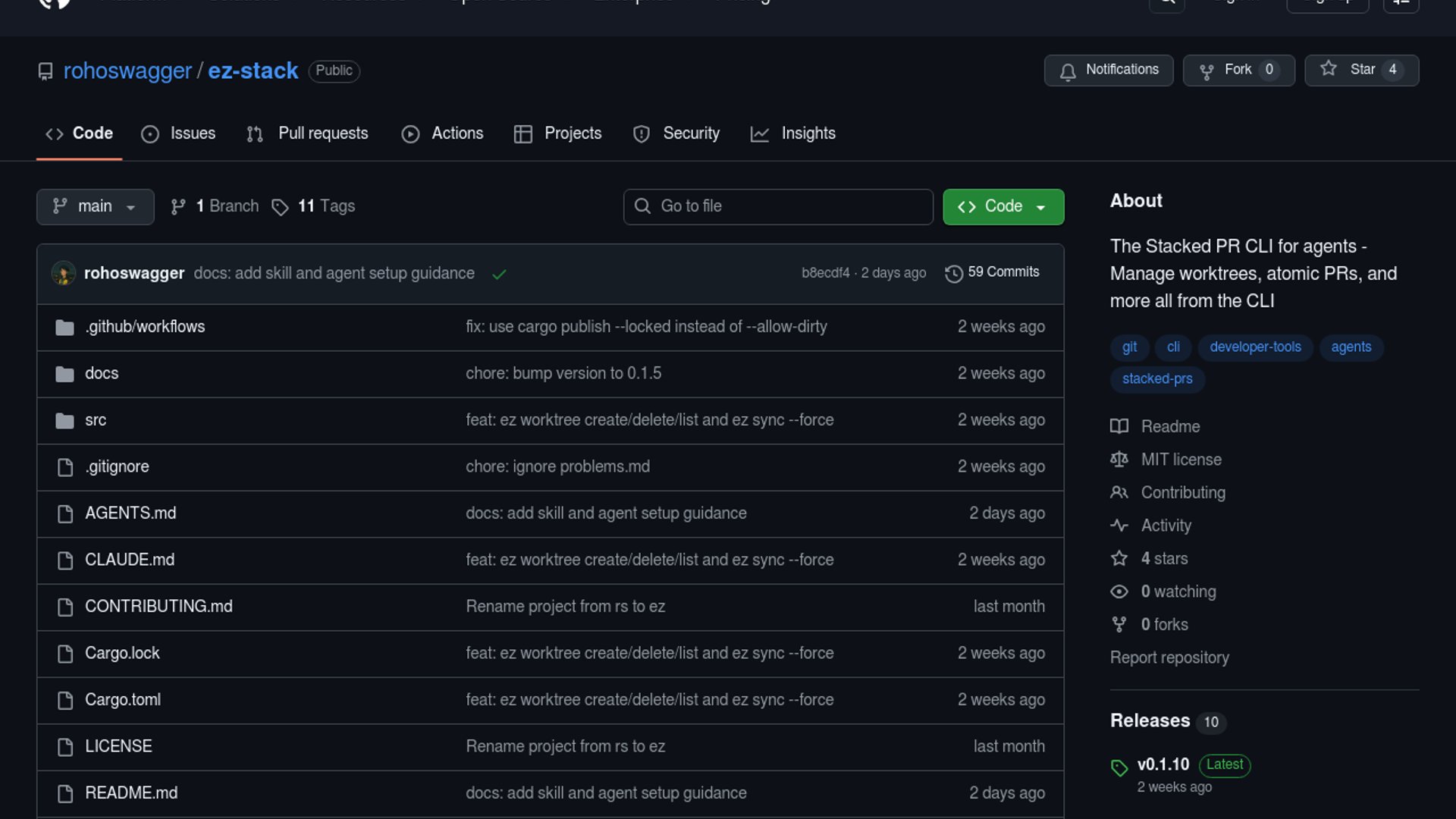 ez is a Rust-powered CLI tool that simplifies managing stacked pull requests on GitHub. It automates rebasing and branch navigation, making it easier for developers and AI agents to handle complex code changes.