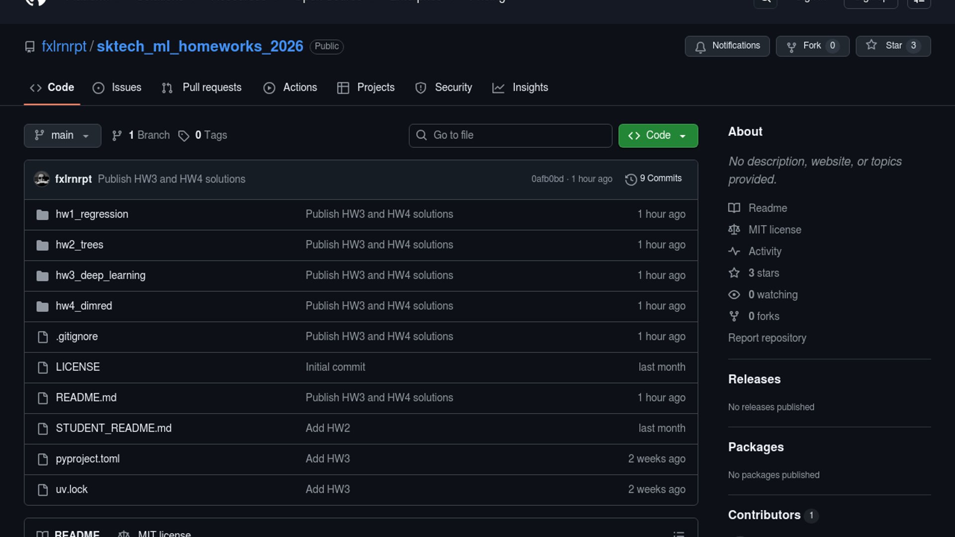 Andrey Goncharov published the homework set he built for Skoltech’s 2026 machine learning course, covering regression, trees, deep learning, and dimensionality reduction. The repo bundles notebooks, helper scripts, auto-tests, grading scripts, and pre-generated test data so students get fast feedback instead of manual review.