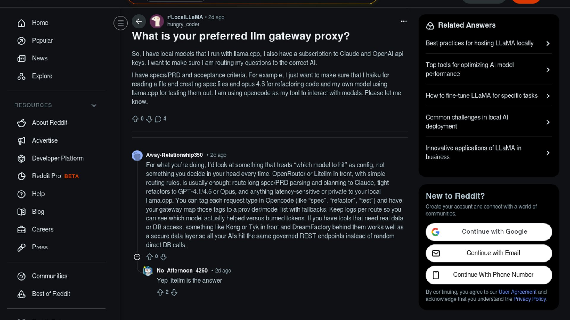 A Reddit thread in r/LocalLLaMA asks how to route work inside OpenCode across Claude, OpenAI, and local llama.cpp models with an LLM gateway proxy. It is less a product announcement than a practical workflow discussion about matching model cost and capability to specific coding tasks like spec writing, refactors, and local test runs.