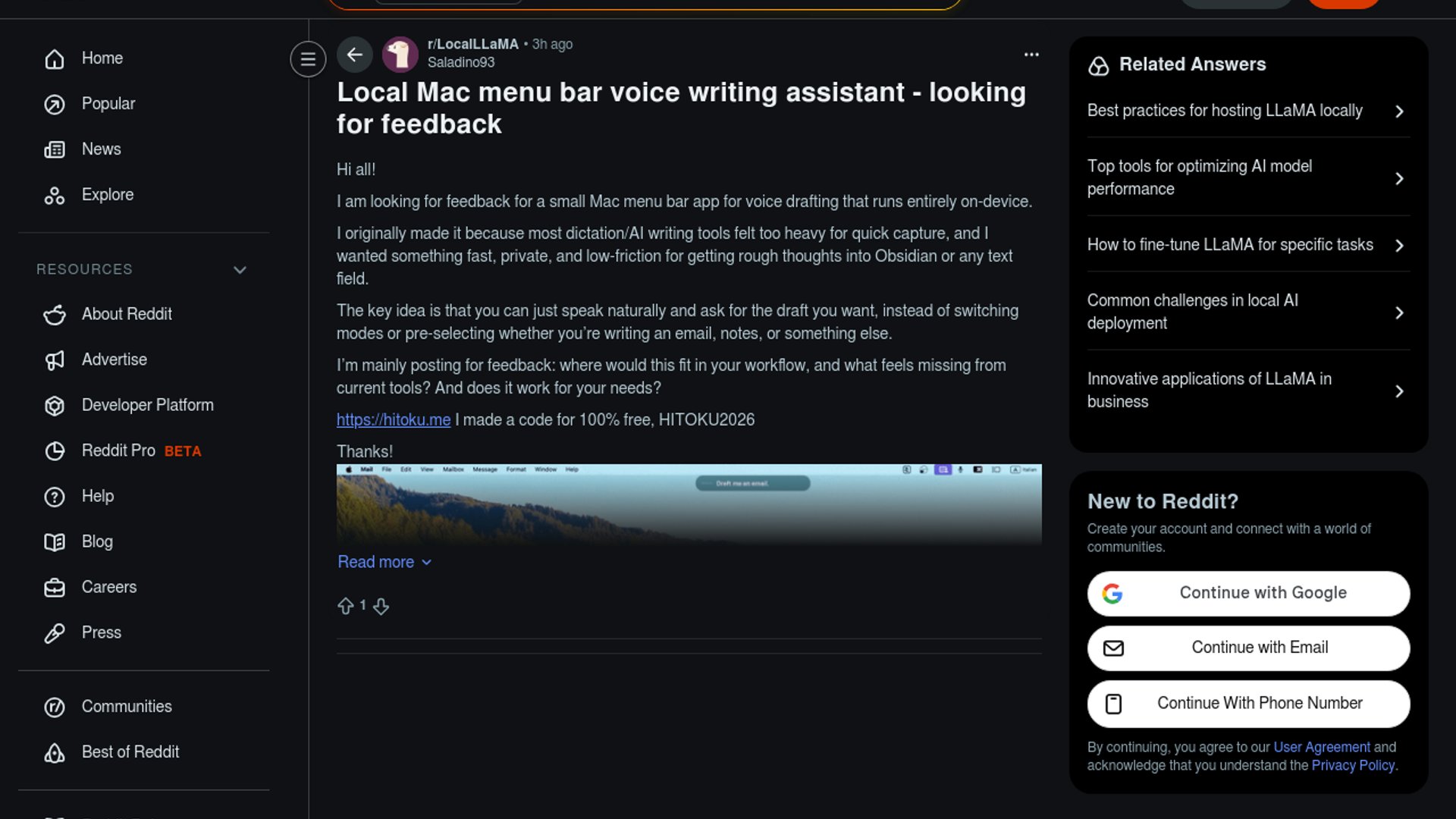 - –Early-stage: score of 1 on Reddit with zero comments — product is pre-traction and seeking early feedback