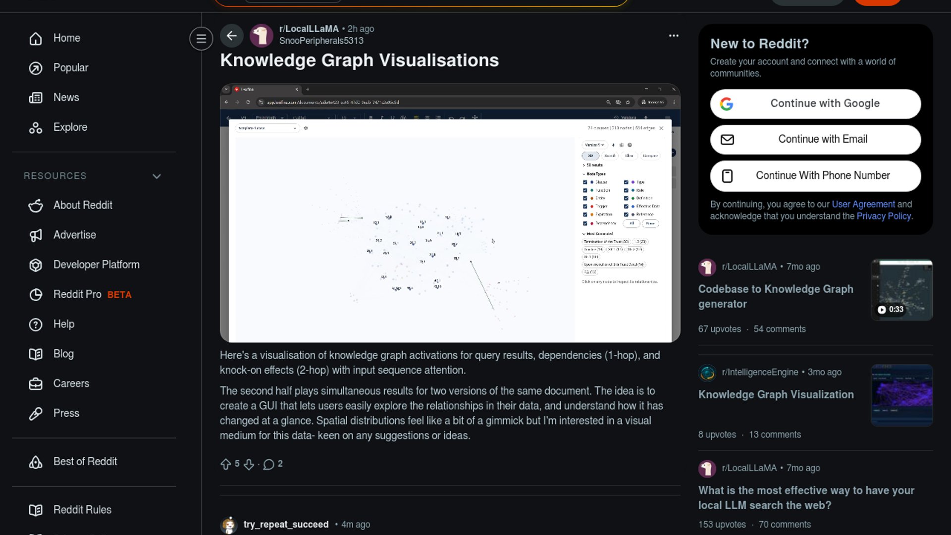 This Reddit demo shows a work-in-progress GUI for visualizing knowledge graph activations: query results, 1-hop dependencies, 2-hop knock-on effects, and input-sequence attention. The second half compares two versions of the same document side by side so changes surface immediately.