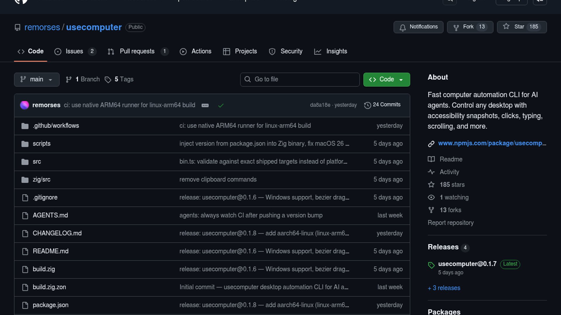 usecomputer is an open source desktop automation CLI for AI agents that runs as a native Zig binary, with no Node.js runtime required. It supports macOS, Linux on X11, and Windows, and exposes the basic building blocks agents need to operate a desktop: accessibility-aware screenshots, mouse movement and clicks, dragging, scrolling, and keyboard typing and key presses. The repo positions it as a practical execution layer for computer-use workflows, including OpenAI-style and Anthropic-style agent integrations.