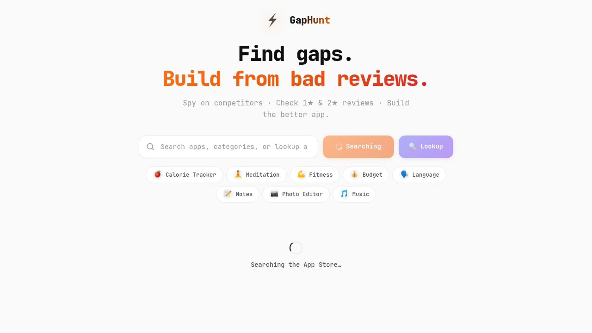 GapHunt launched on Product Hunt as a research tool that scans 1★ and 2★ app reviews, competitor feedback, and category searches to surface unmet product opportunities. Its pitch is simple: stop brainstorming in a vacuum and build from real user complaints, with AI-powered market analysis layered on top.