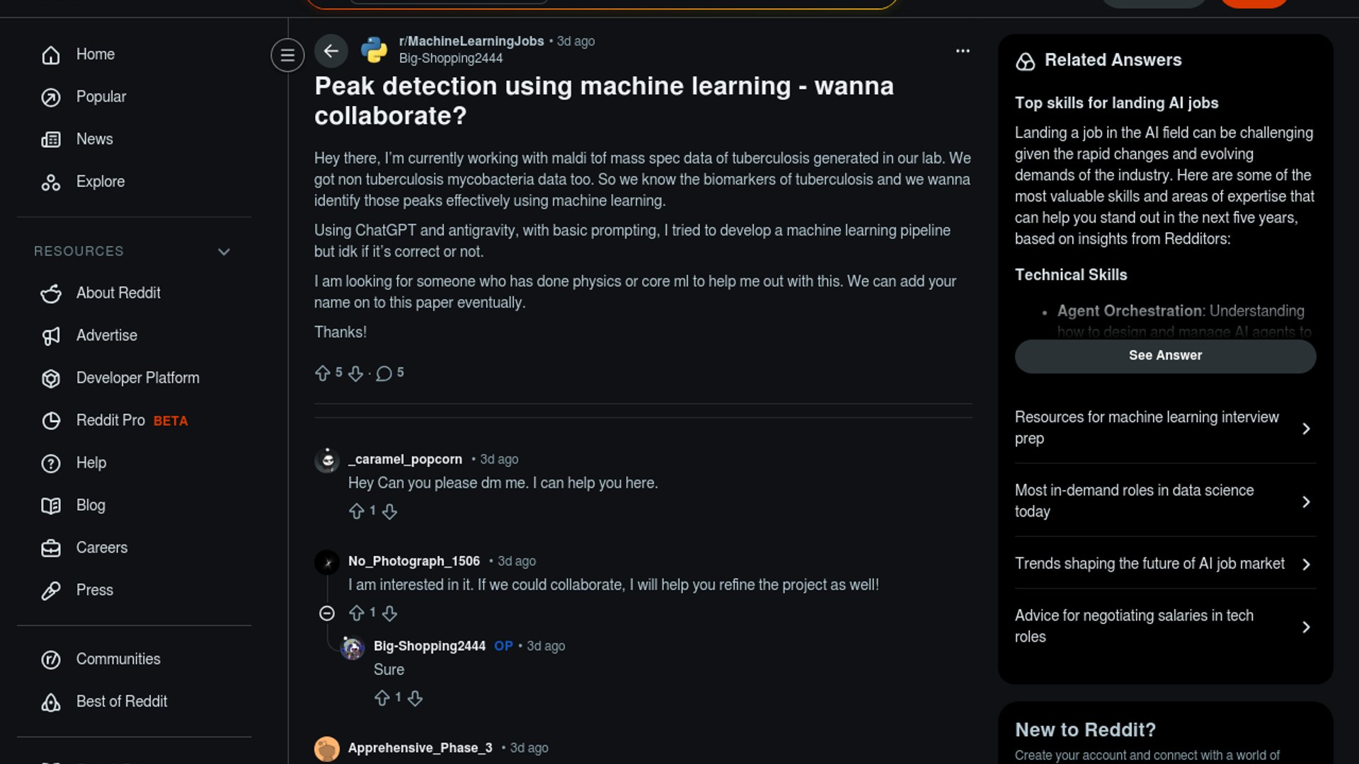 A Reddit post in r/MachineLearning asks for collaborators to validate and improve a machine-learning pipeline for detecting tuberculosis biomarker peaks from MALDI-TOF mass spectrometry data, with non-tuberculosis mycobacteria as comparison data. The author is seeking physics/core-ML expertise and offers paper co-authorship for contributors.