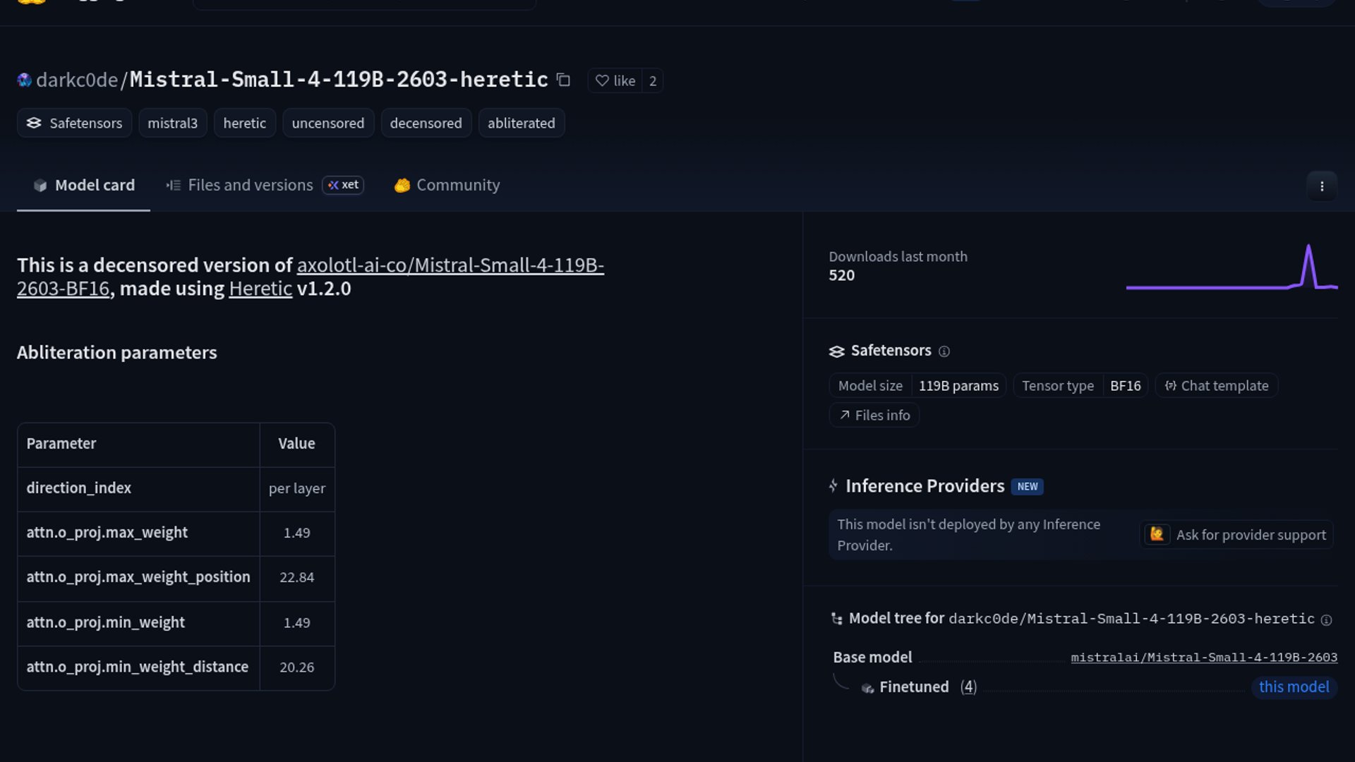 Darkc0de's Heretic build is a decensored BF16 fork of axolotl-ai-co/Mistral-Small-4-119B-2603-BF16, and the Reddit post says the real blocker for local users is still a GGUF build. The model card claims far fewer refusals than the original, but the thread is still tiny and early.