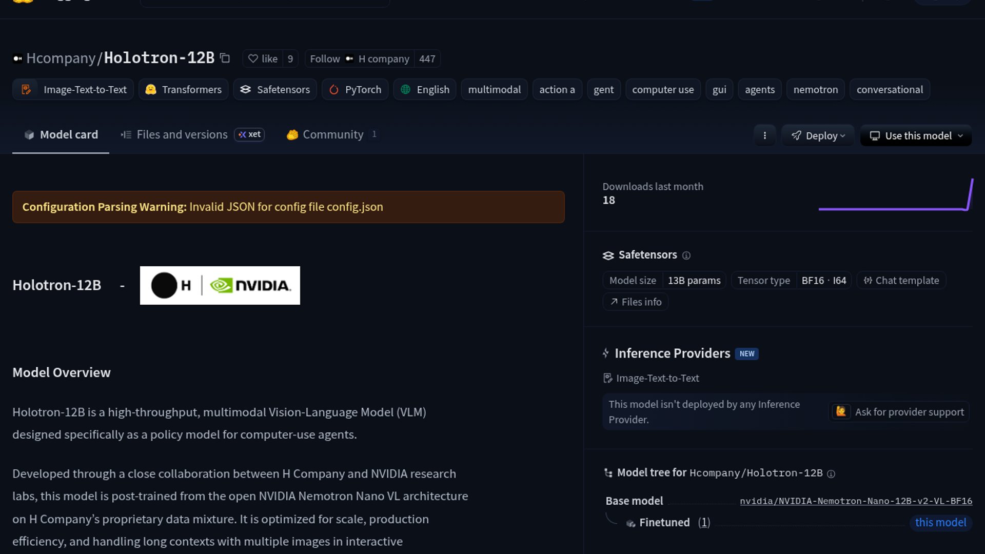 Holotron-12B is a new multimodal 12B VLM from H Company and NVIDIA, released on March 16, 2026 under the NVIDIA Open Model License and tuned for UI navigation and agentic computer-use workloads. In the team’s published evals, it reports over 2x higher throughput than Holo2-8B on WebVoyager-style concurrent runs while improving benchmark performance from its Nemotron-Nano base.