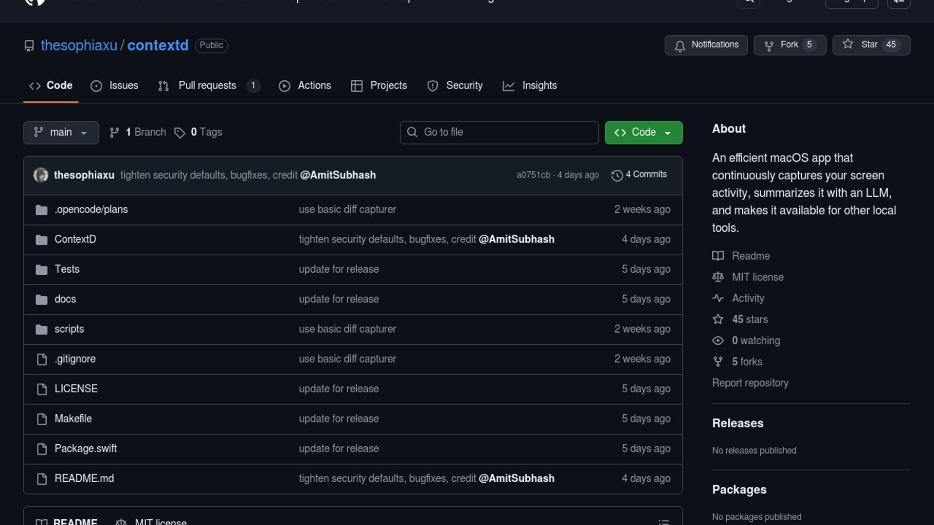 ContextD is a macOS menu bar app that snapshots the screen every two seconds, OCRs changed regions, and turns the stream into searchable LLM summaries. It keeps captures in local SQLite and exposes a localhost HTTP API and prompt-enrichment flow so other tools can reuse recent activity.
