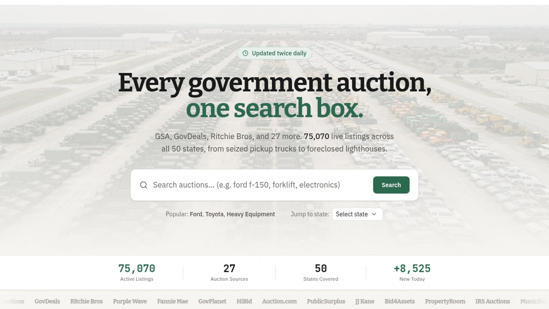 - –Useful for vehicle, heavy equipment, surplus, and seized-property buyers who care about breadth and speed.