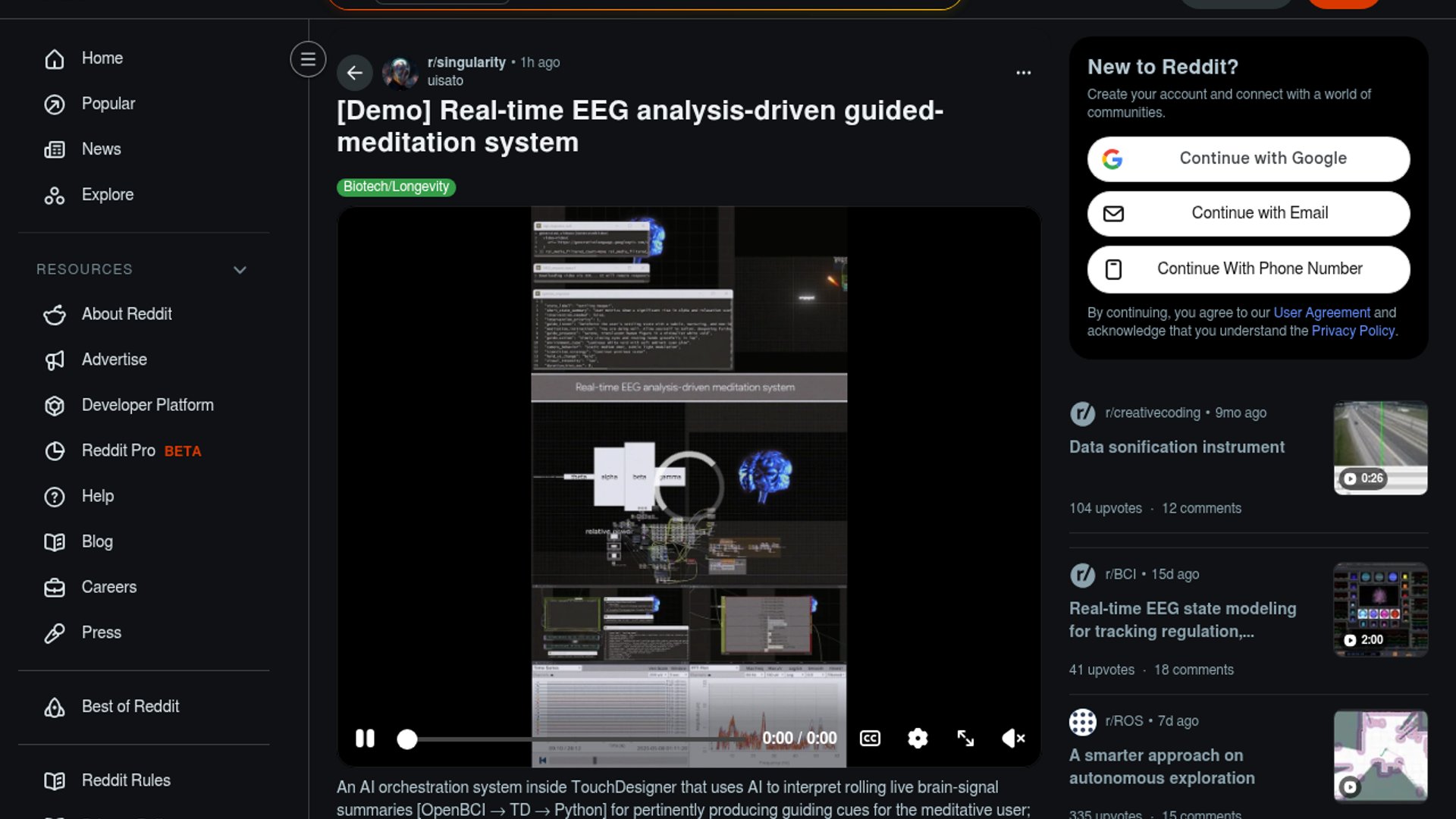 A TouchDesigner-based demo pipes OpenBCI brain-signal summaries through Python and AI to decide when and how to guide a meditator with voice, light, text, and video. It is a closed-loop biofeedback experiment, not a consumer app, but it shows how agentic orchestration can sit on top of live physiological data.