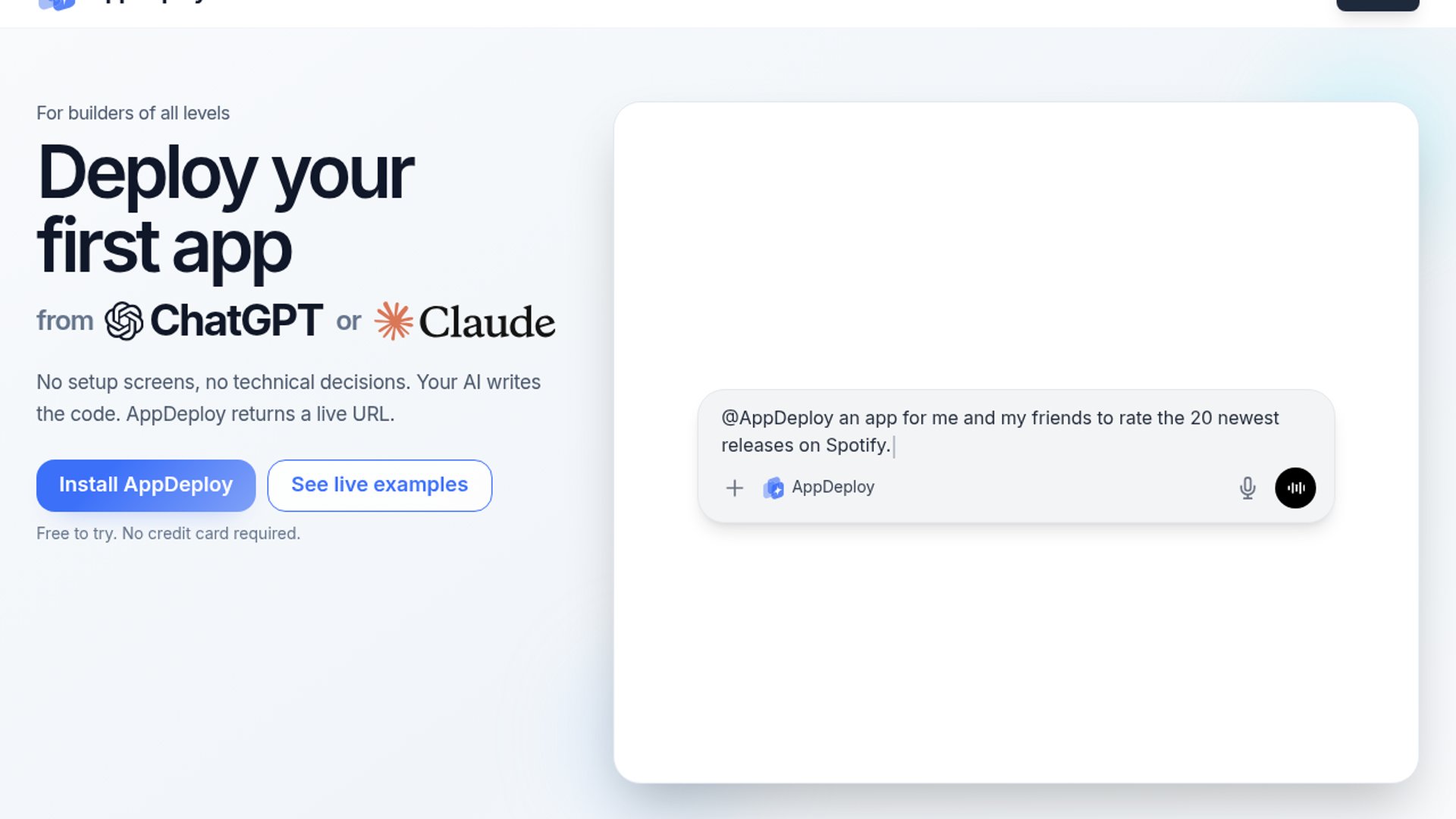 AppDeploy is a chat-native deployment platform that promises to take an app from natural-language prompt to a public, production-style URL without leaving ChatGPT, Claude, Cursor, Codex, or another compatible AI agent. The product emphasizes removing setup overhead by handling hosting, database, auth, storage, secrets, background jobs, notifications, realtime, QA, logs, and rollback automatically, which positions it as an end-to-end launch layer for AI-built software rather than just another code assistant.