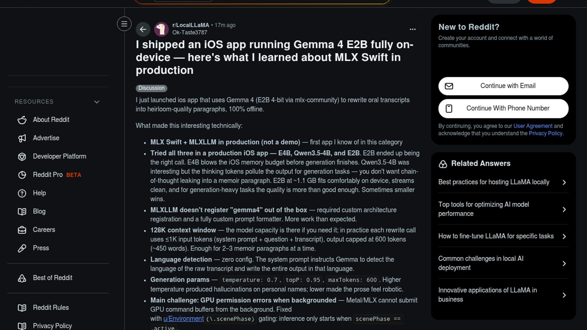 A developer shipped an iPhone app that rewrites oral transcripts into polished paragraphs using Gemma 4 E2B entirely on-device. The post is also a production report on MLX Swift and MLXLLM, covering model selection, custom architecture wiring, and iOS lifecycle pitfalls.