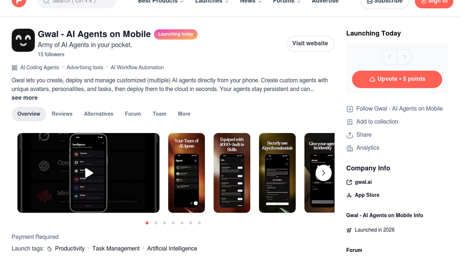 Gwal launches as a mobile-first platform for creating, deploying, and managing persistent AI agents from a phone. The pitch is an “AI workforce in your pocket,” with cloud deployment, agent collaboration, API connections, and thousands of plug-in skills.