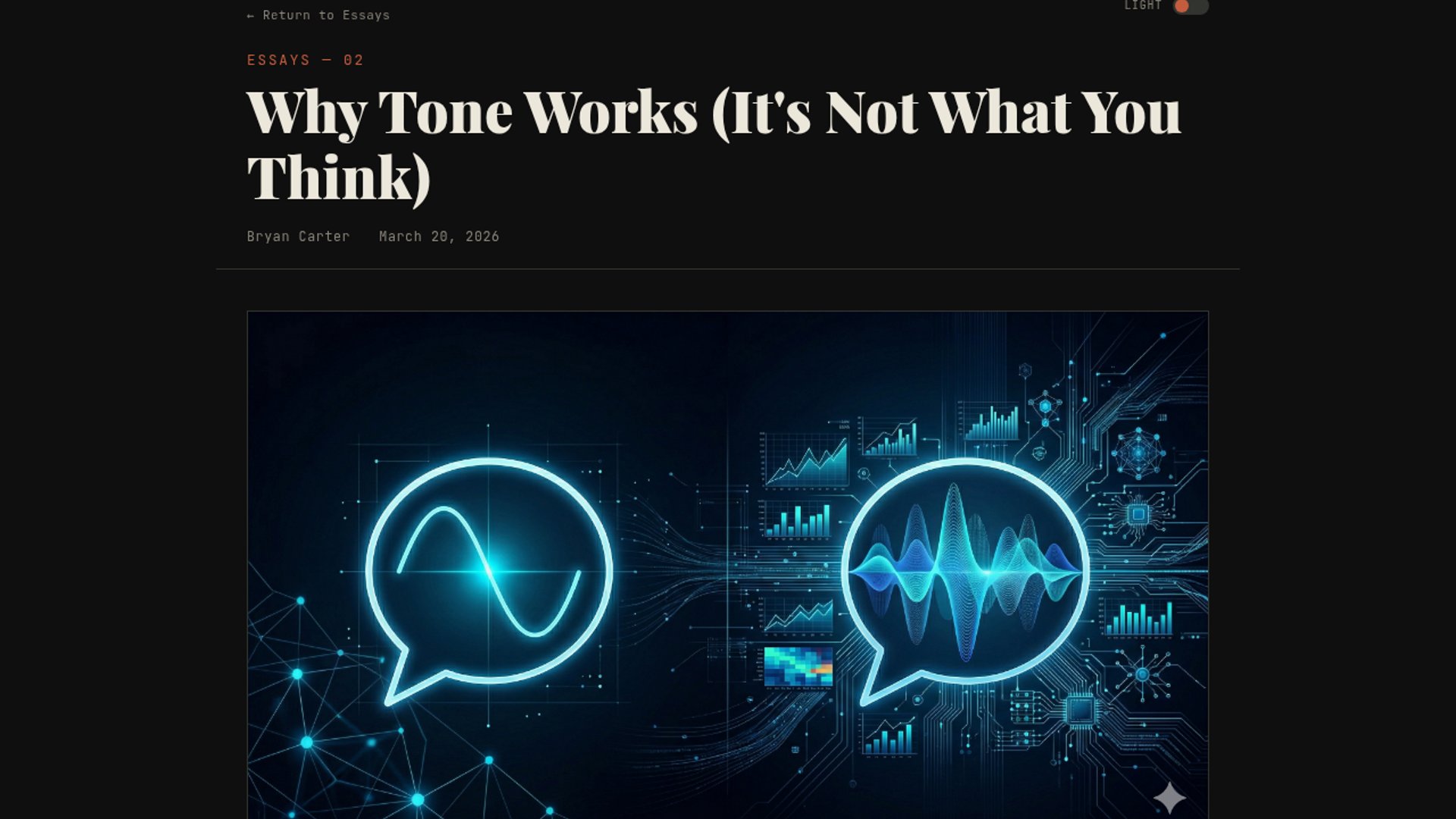 Bryan Carter’s essay argues that tone improves LLM responses because it loads richer context, not because models respond emotionally. The piece frames “tone” as a practical prompt-engineering signal that helps models infer domain, depth, and expected answer style.