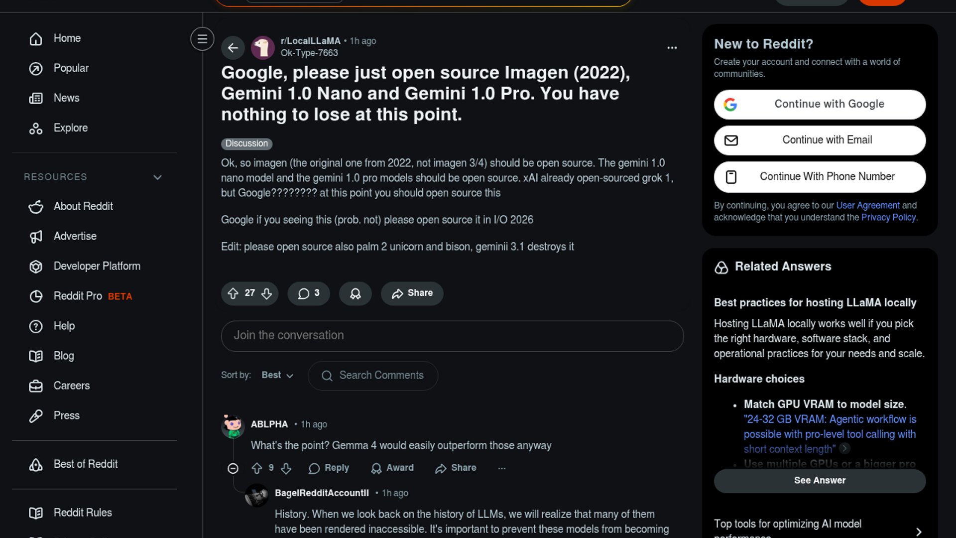 A Reddit thread in r/LocalLLaMA asks Google DeepMind to open-source the original Imagen from 2022, Gemini 1.0 Nano, and Gemini 1.0 Pro, later adding PaLM 2 Unicorn and Bison. It’s a community wishlist, not an official announcement.