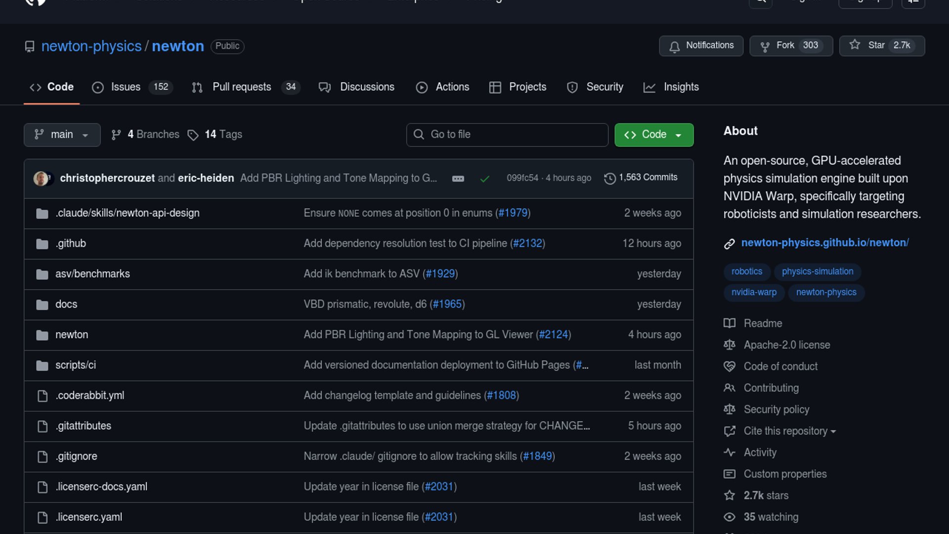 Newton is an open-source physics simulation engine for robotics, built on NVIDIA Warp and aimed at roboticists and simulation researchers. It extends Warp's simulation stack, uses MuJoCo Warp as a primary backend, and emphasizes GPU acceleration, differentiability, and extensibility.