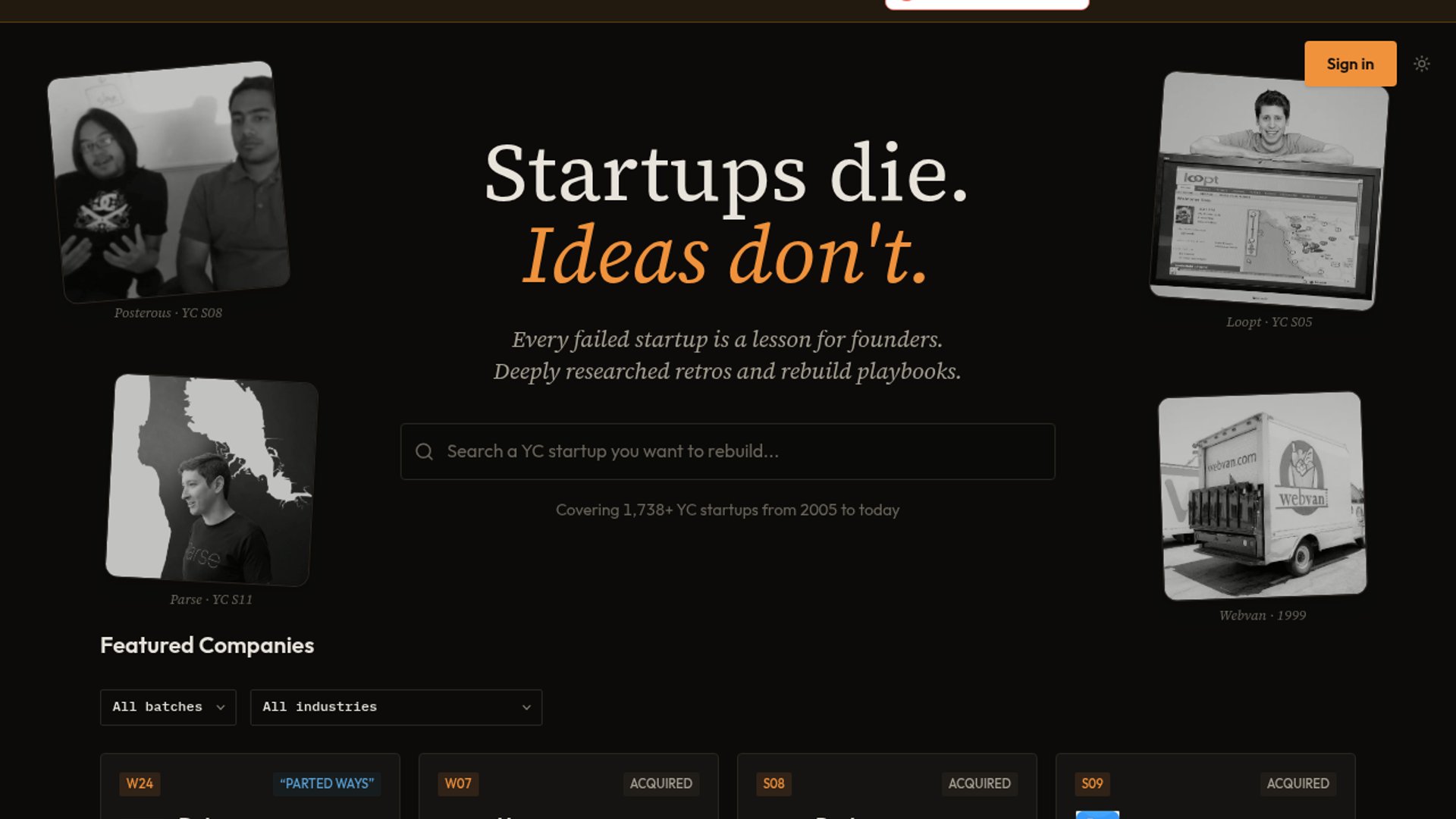 Startups.RIP is a wiki of 1,738+ YC startups that shut down or got acquired, paired with AI-written post-mortems and rebuild playbooks. The pitch is simple: turn startup failures into structured, implementation-ready ideas you can actually build from.
