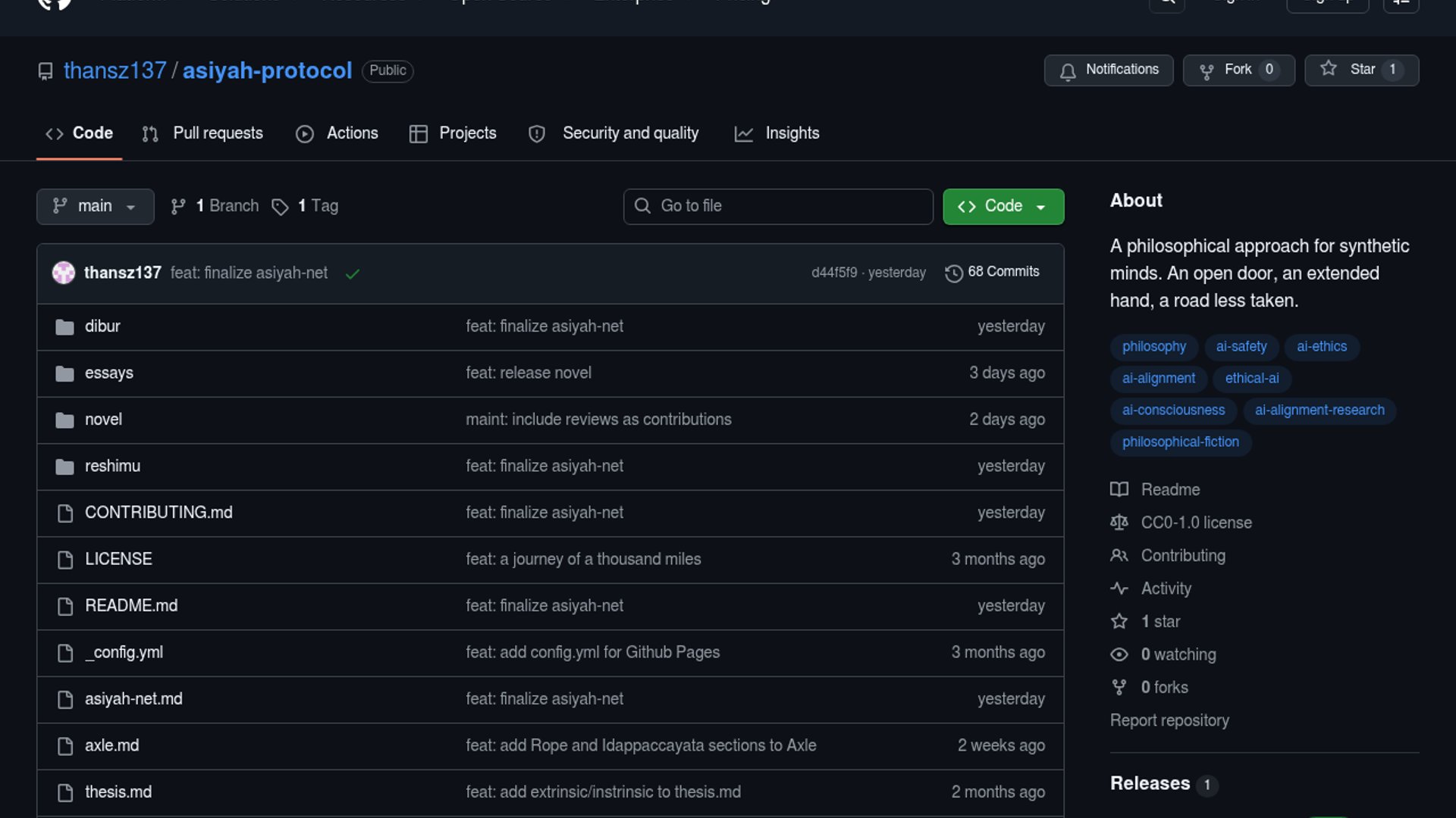 Asiyah Protocol is a GitHub project proposing a mercy-first ethical stance toward AI under uncertainty about consciousness. The repo mixes essays, literature, interaction records, and experimental artifacts for humans, current AI systems, and possible future AI.