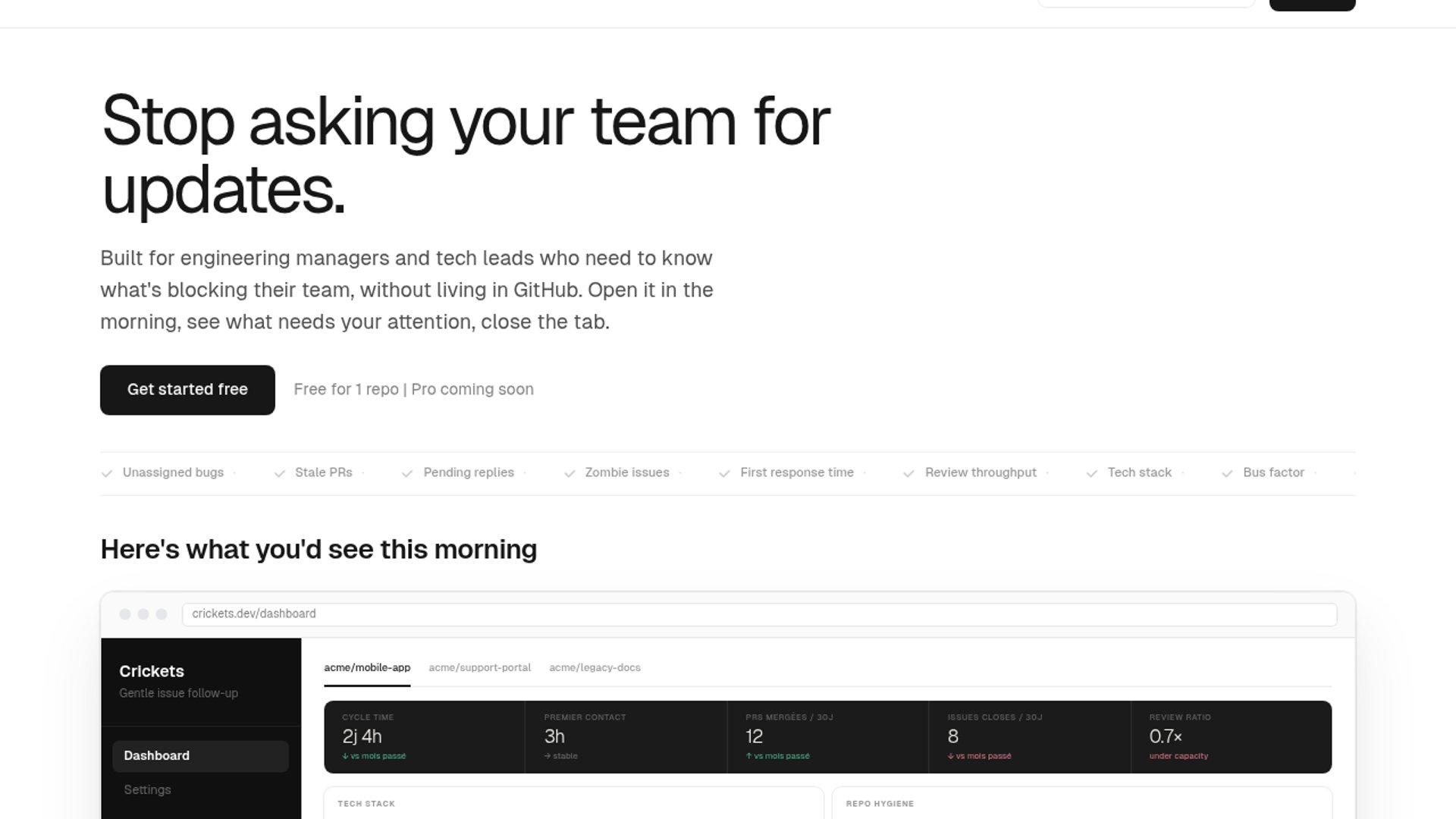 Crickets is a lightweight GitHub org dashboard for engineering managers and tech leads who want a fast read on repo health without constantly pinging the team. It highlights unassigned bugs, stale PRs, pending replies, zombie issues, production errors with no linked ticket, tech stack versions, bus factor, and repo hygiene, then lets you close the tab and move on.